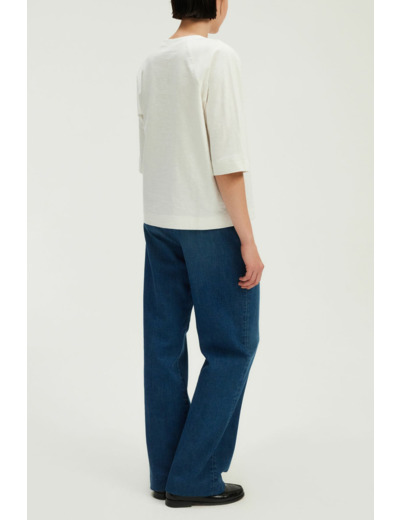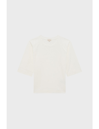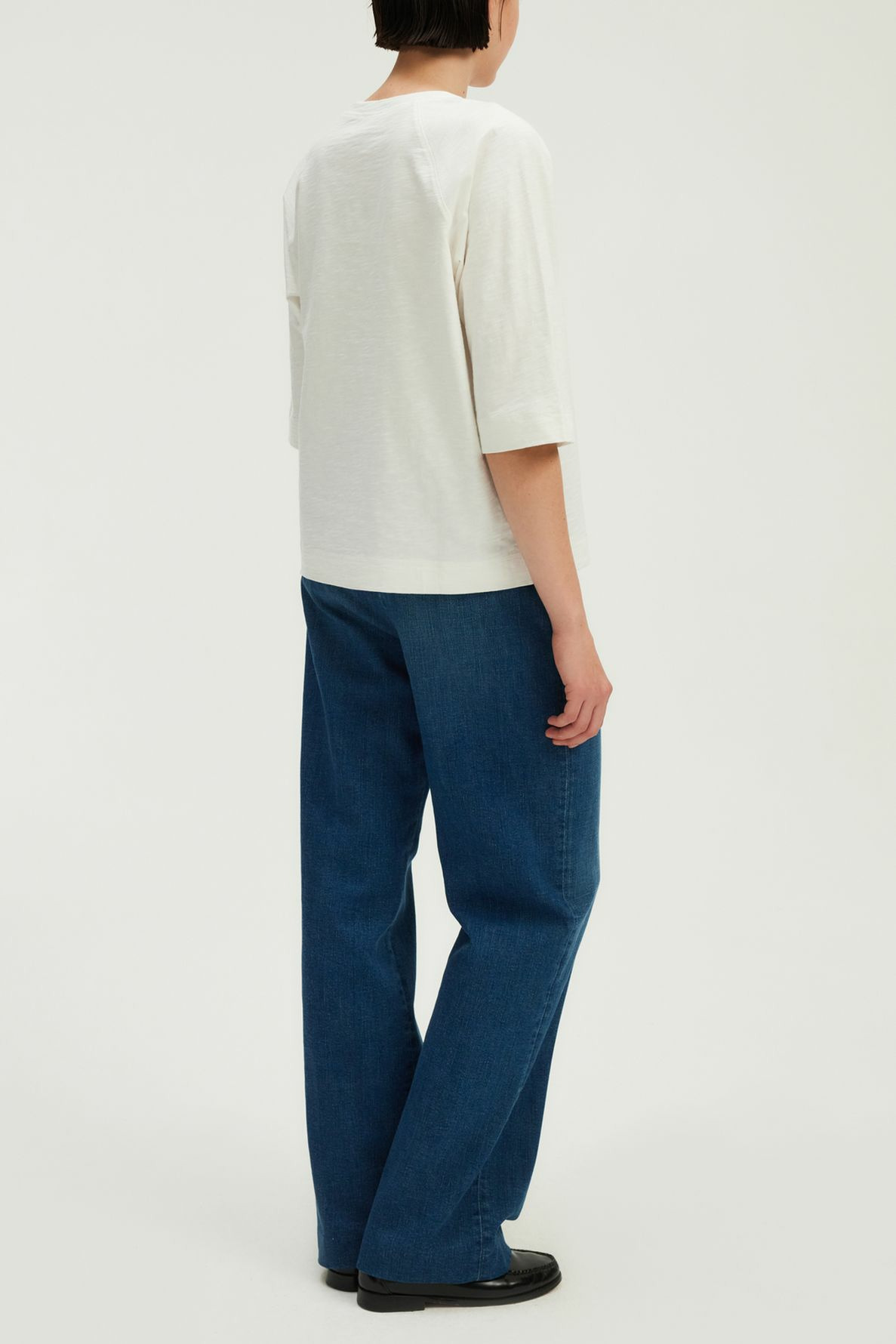 Confectionné en coton flammé, ce T-shirt offre une texture douce et légèrement texturée qui rappelle la qualité d’un sweat léger. Sa forme droite et son volume ample assurent une liberté de mouvement optimale, tandis que les manches mi-longues et l’emmanchure raglan apportent une touche moderne et confortable. Le col rond classique et les surpiqûres ton sur ton renforcent son allure épurée et élégante.