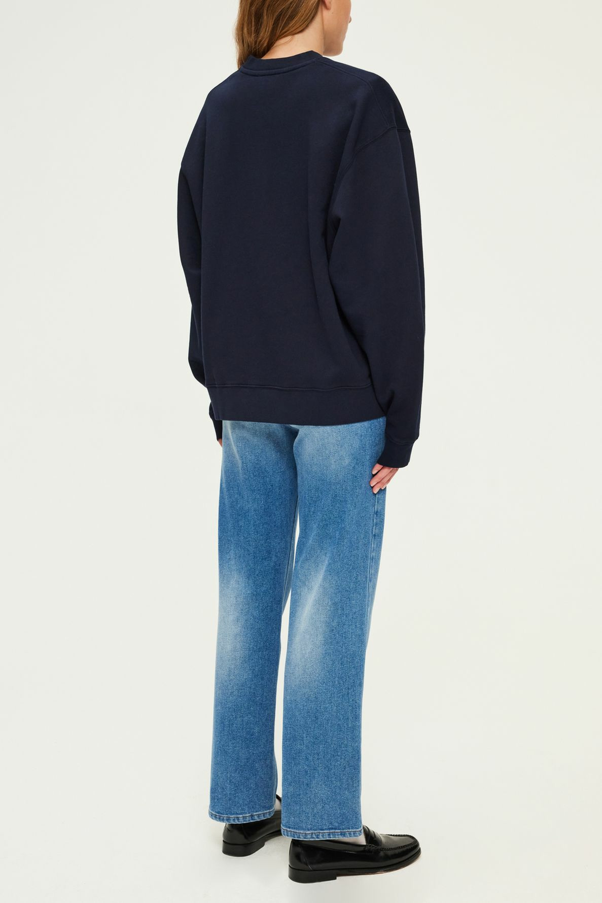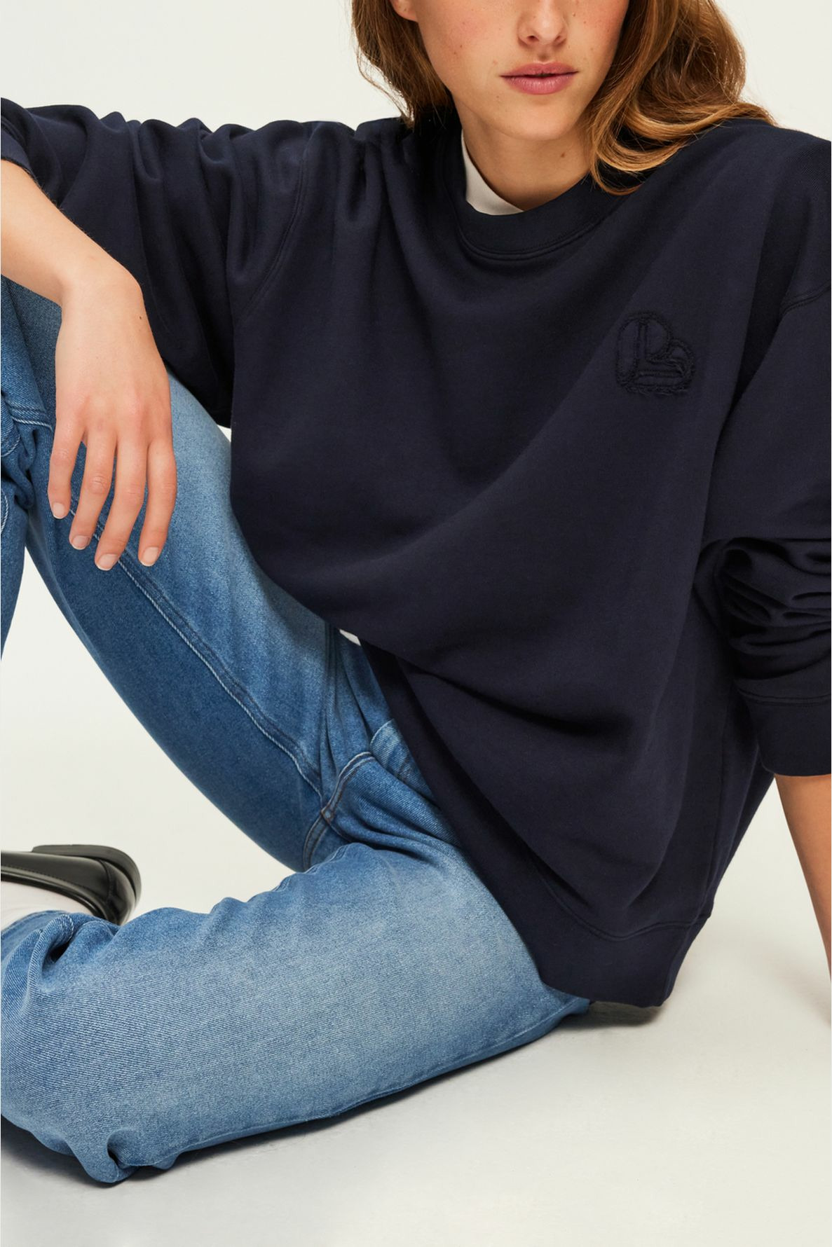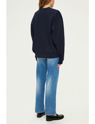 Forme droite, coton uni, emmanchure basse au niveau des épaules, col rond, manches longues, intérieur bouclette pour plus de confort, finitions bord-côtes. La mannequin mesure 174 cm et porte une taille 1.