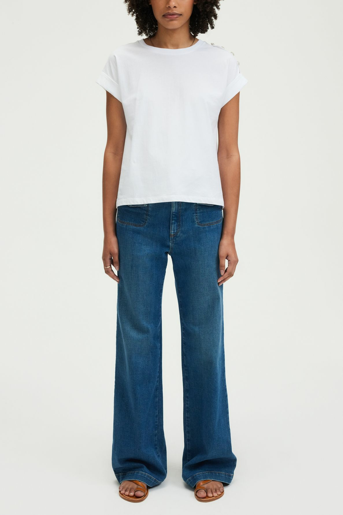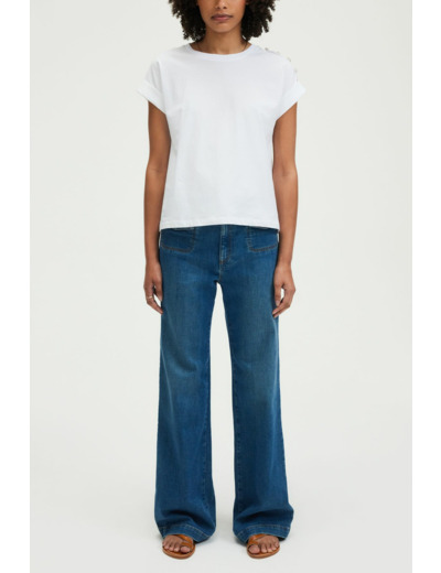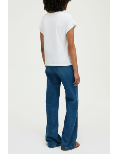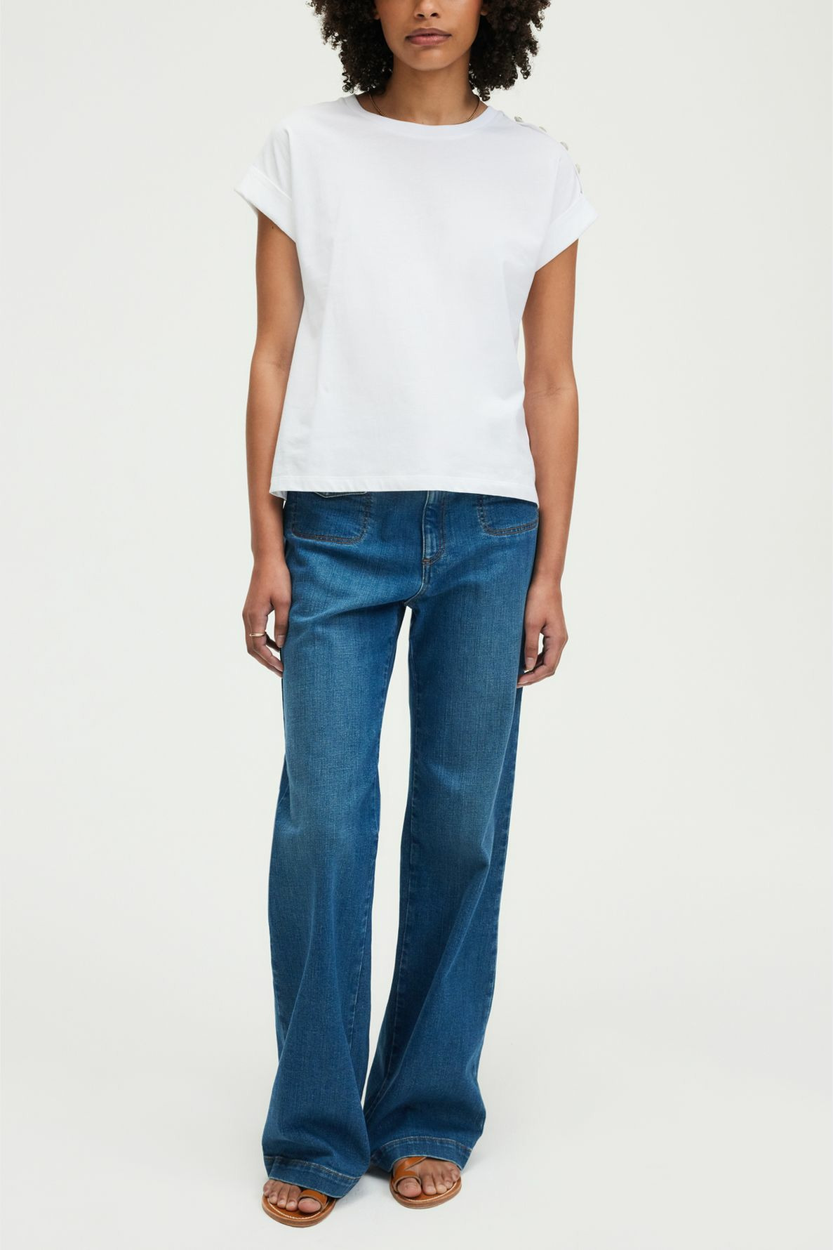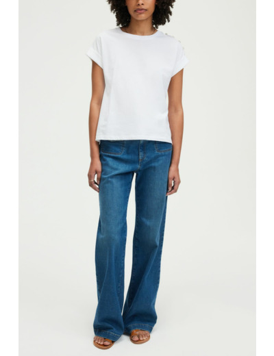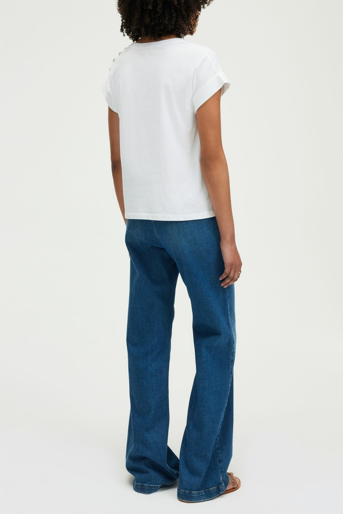 Ce t-shirt se distingue par ses boutons décoratifs à l’épaule, un détail subtil qui fait toute la différence et personnalise votre tenue sans effort. Sa longueur standard permet de le porter aussi bien rentré que sorti, s’adaptant à toutes vos envies de style.