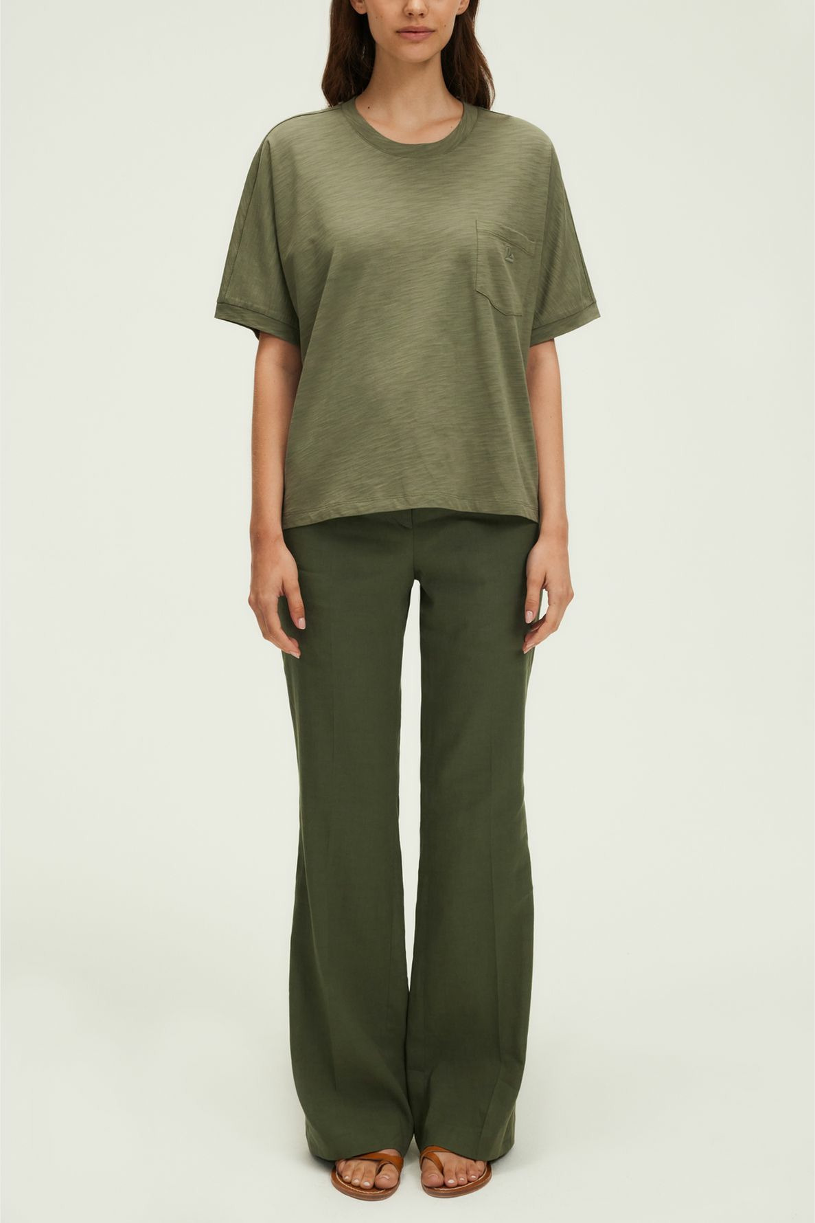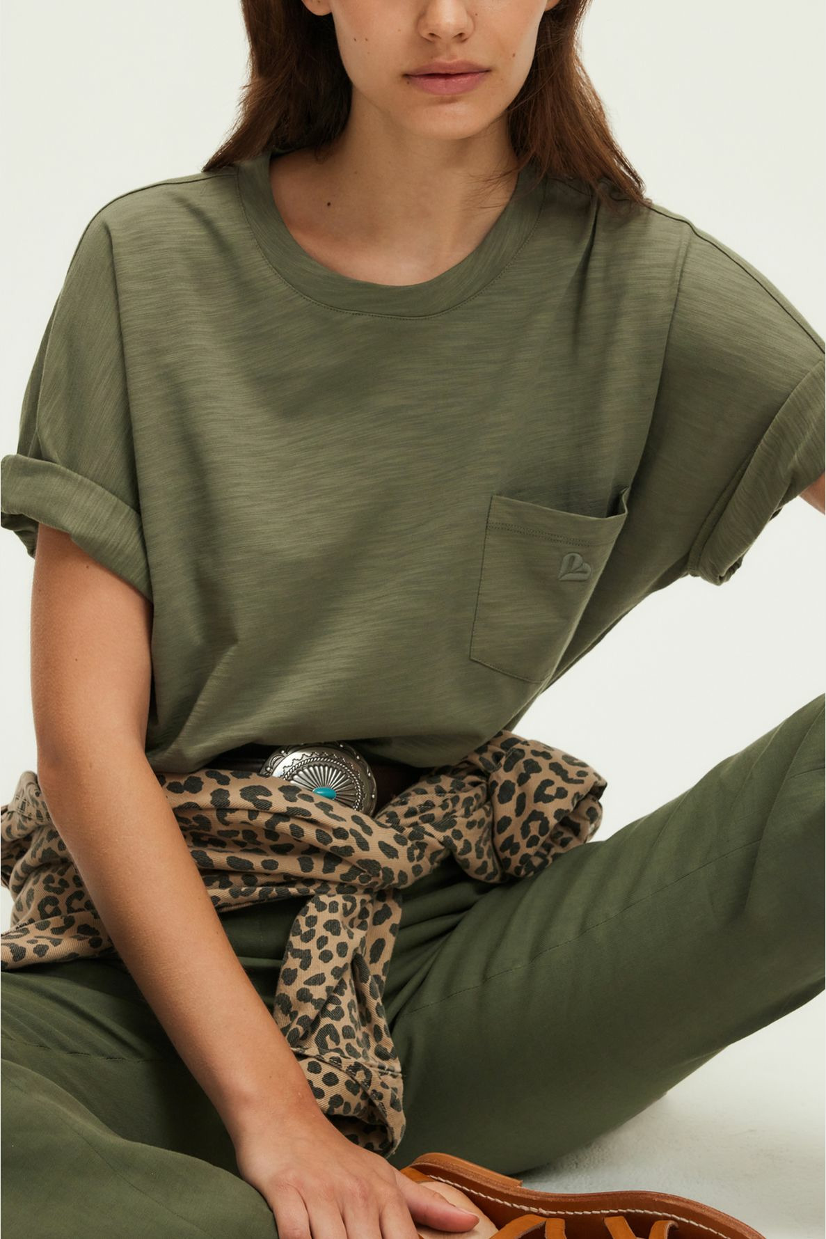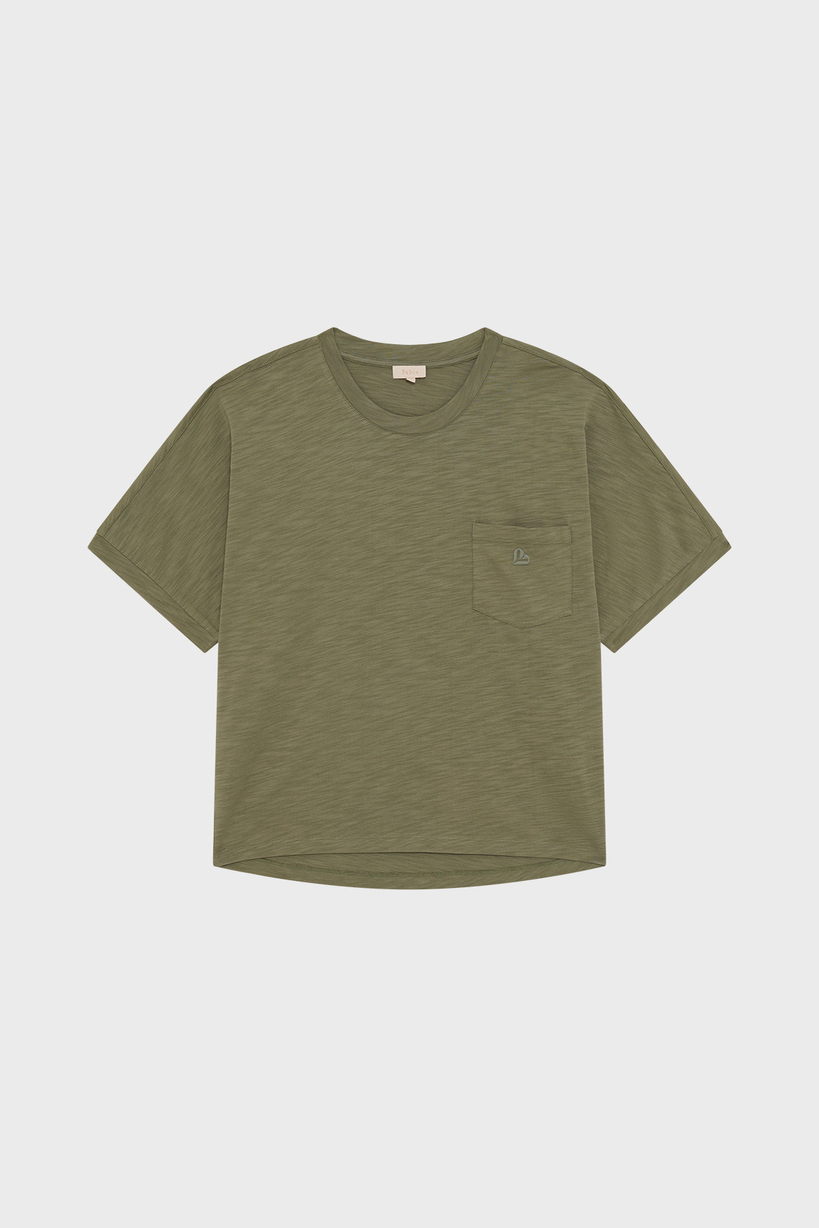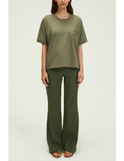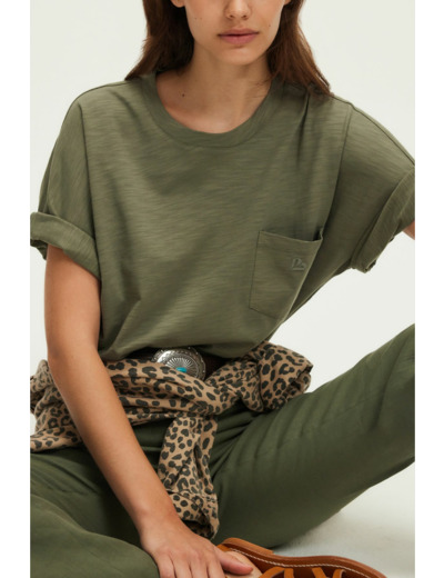 Forme droite, coton flammé uni, col rond, manches courtes, poche poitrine avec monogramme brodé, épaules tombantes, empiècements sur les épaules et bas des manches.