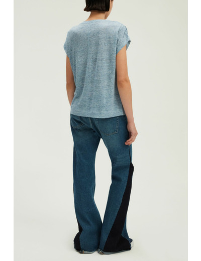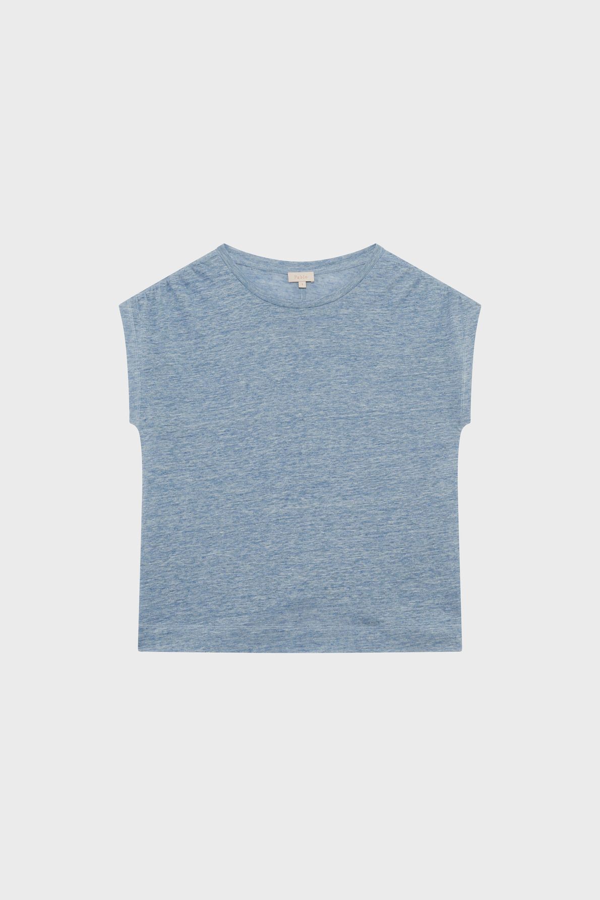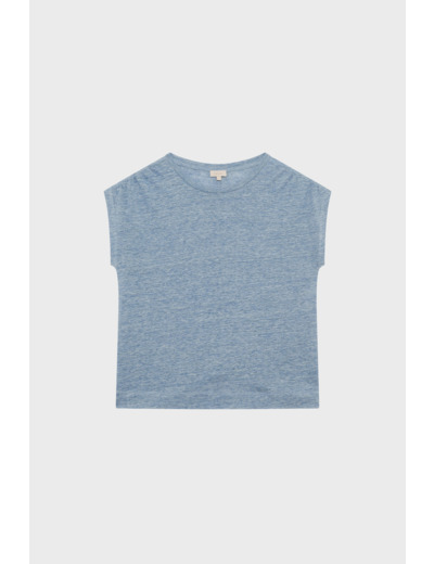 100 % lin uni chiné bleu ciel, coupe droite, col rond, manches très courtes, épaules froncées, couture verticale au dos.