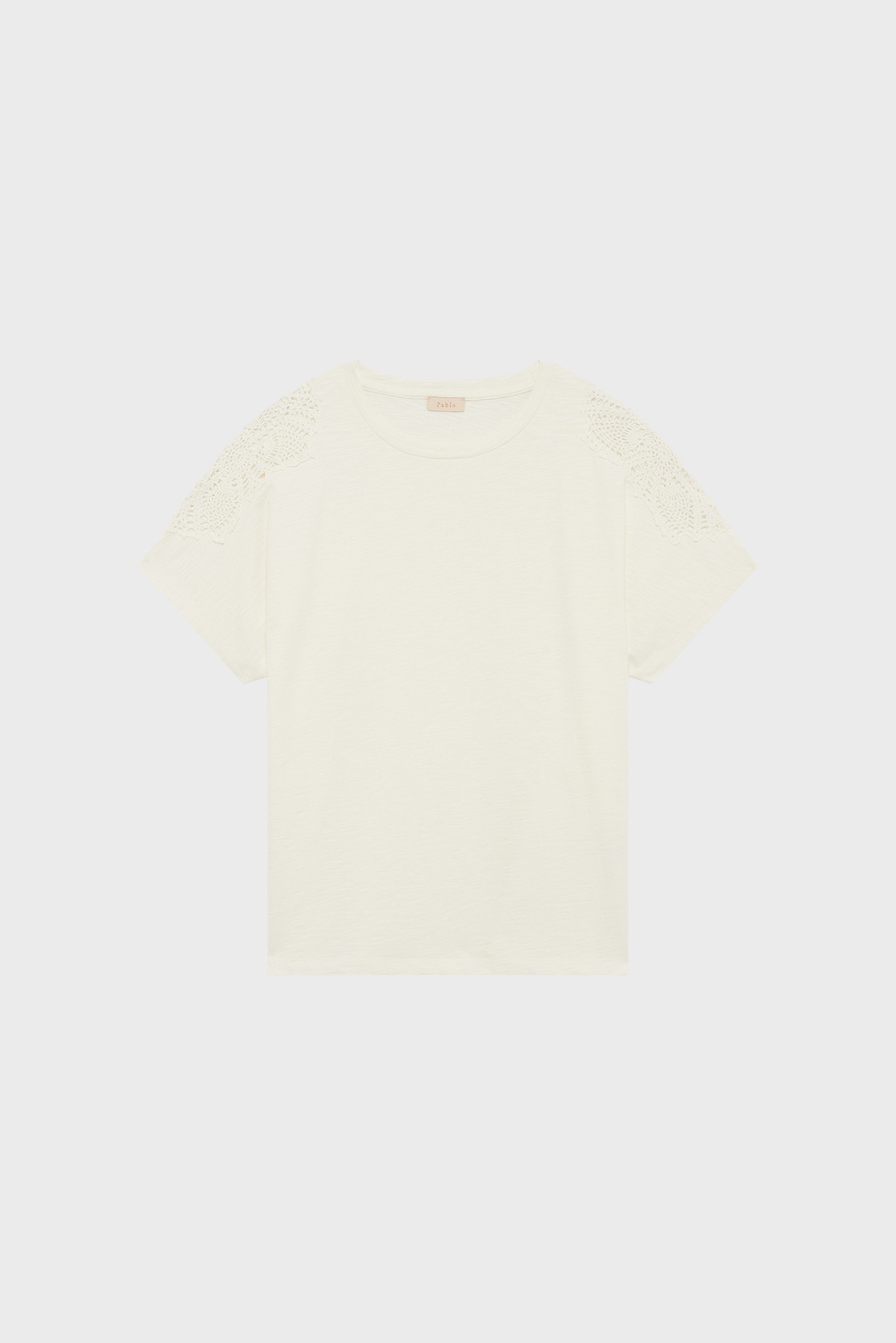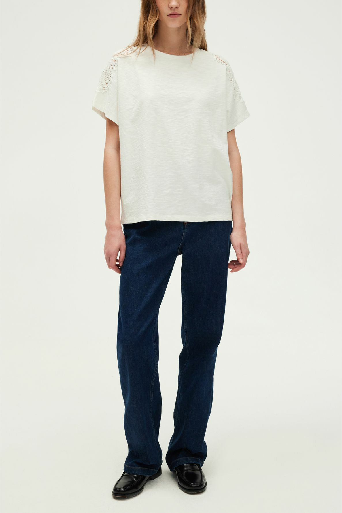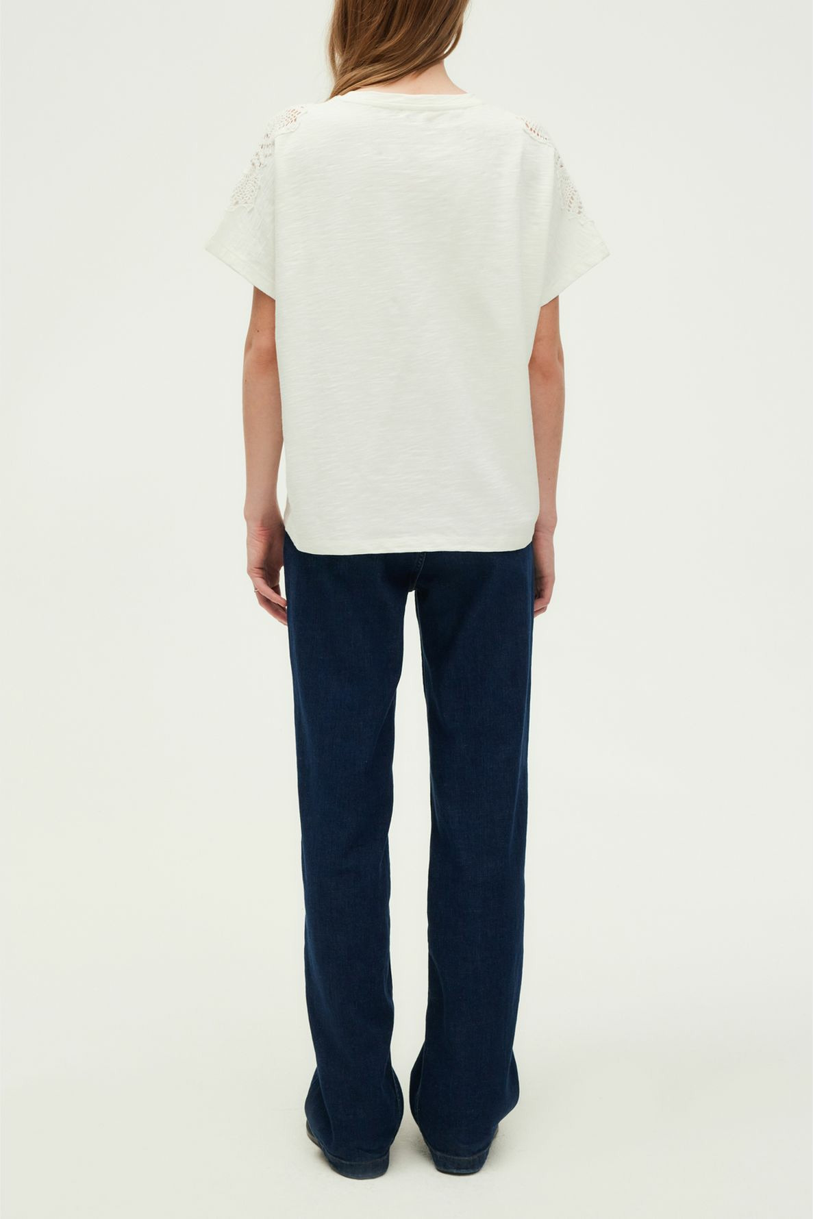 Confectionné en coton 100% uni à l’aspect flammé, ce T-shirt offre une texture douce et un toucher naturel. Le dessus des épaules en broderies anglaises apporte une touche raffinée et délicate, rehaussant la silhouette sans surcharge. Sa coupe droite et ses manches courtes larges garantissent un confort optimal tout en valorisant une allure décontractée et moderne.