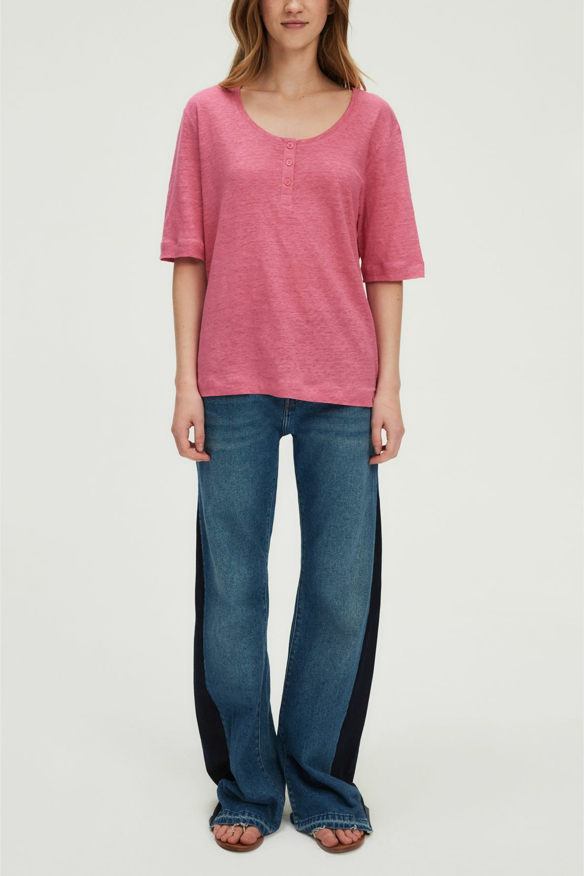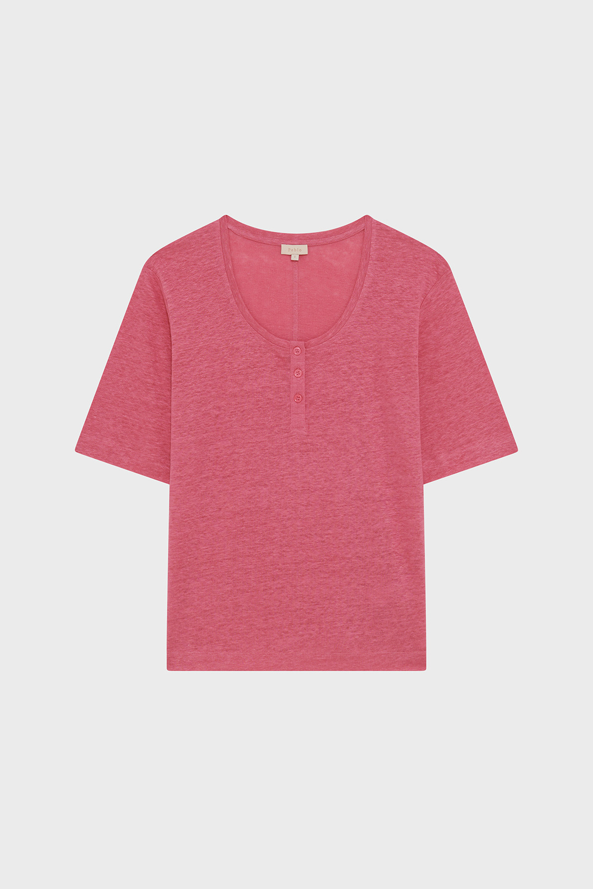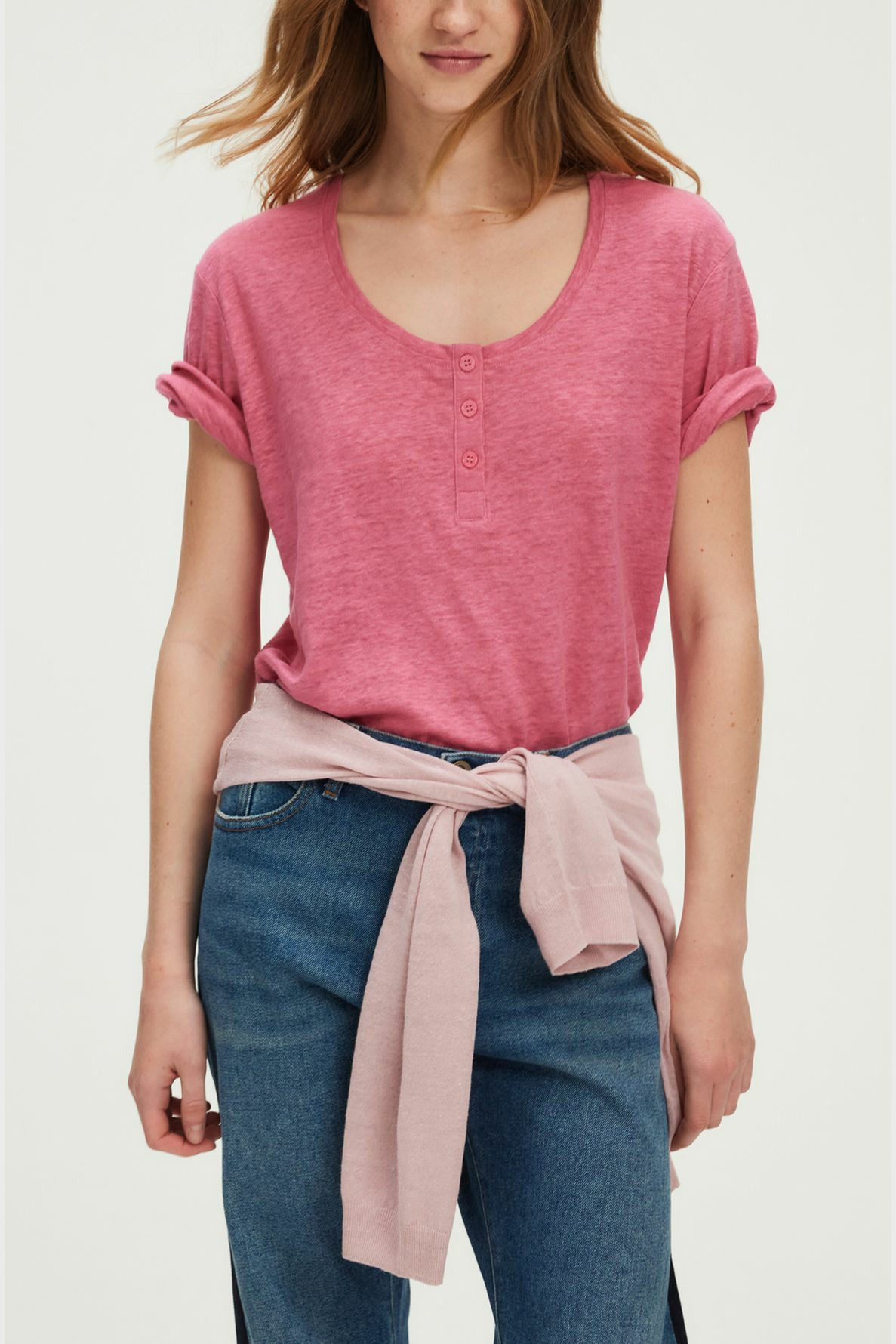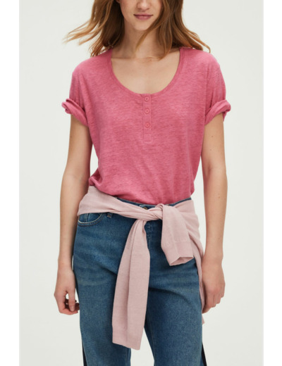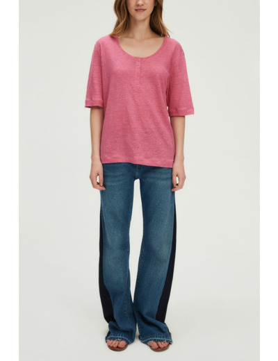 T-shirt en 100% lin uni, coloris rose vif. Coupe droite et large avec emmanchure basse. Col rond avec encolure boutonnée. Manches courtes. Longueur standard.