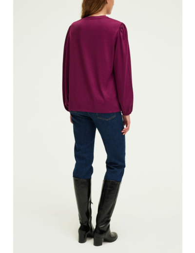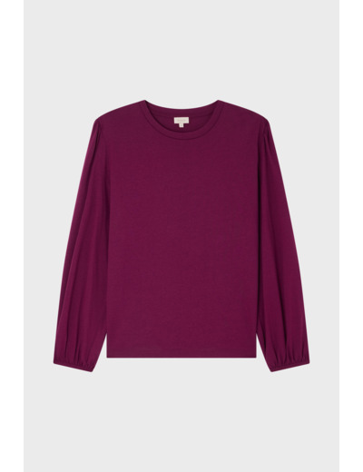 Forme droite, tissu uni, longueur standard, col rond, manches longues avec poignets élastiqués, épaules et bas de manches légèrement froncés. La mannequin mesure 174 cm et porte une taille 2.