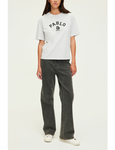 100 % coton flammé, forme droite, longueur standard, col rond, manches courtes, motif sérigraphié. La mannequin mesure 180 cm et porte une taille 2.