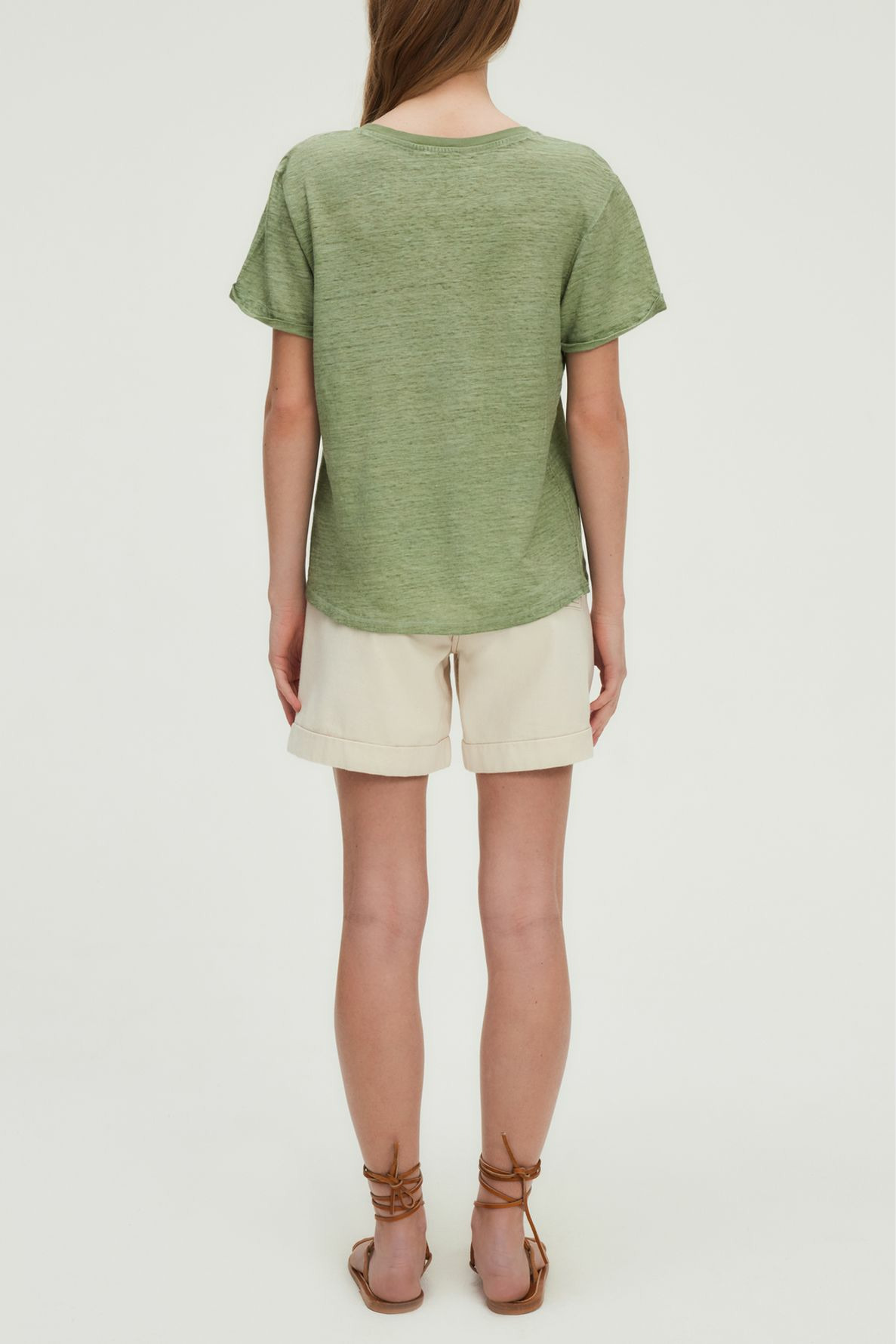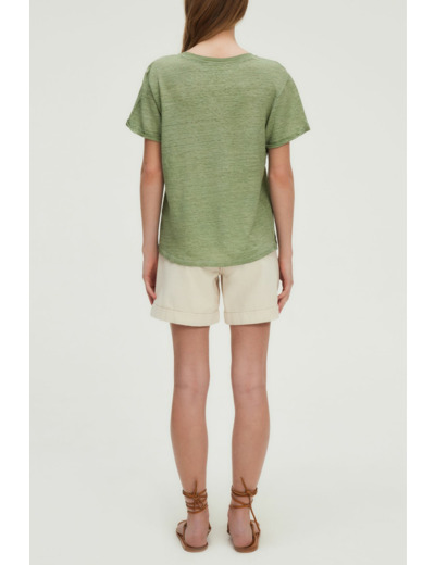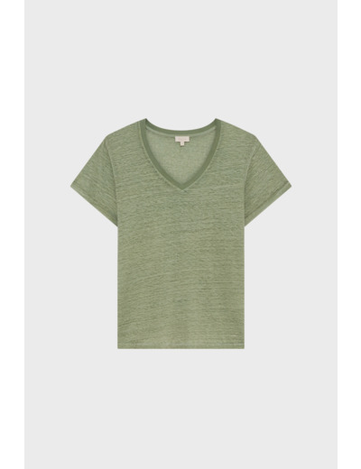 Adoptez l’élégance naturelle avec ce t-shirt col V en lin, subtilement blanchi pour un effet unique et authentique. Sa teinte vert lychen apporte une touche de fraîcheur à toutes vos tenues, qu’elles soient claires ou foncées.