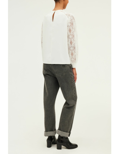 Forme droite, motif en dentelle sur épaules et manches, col rond, manches longues avec poignets élastiqués smockés, fente en haut du dos fermée par un bouton rond. La mannequin mesure 180 cm et porte une taille 38.