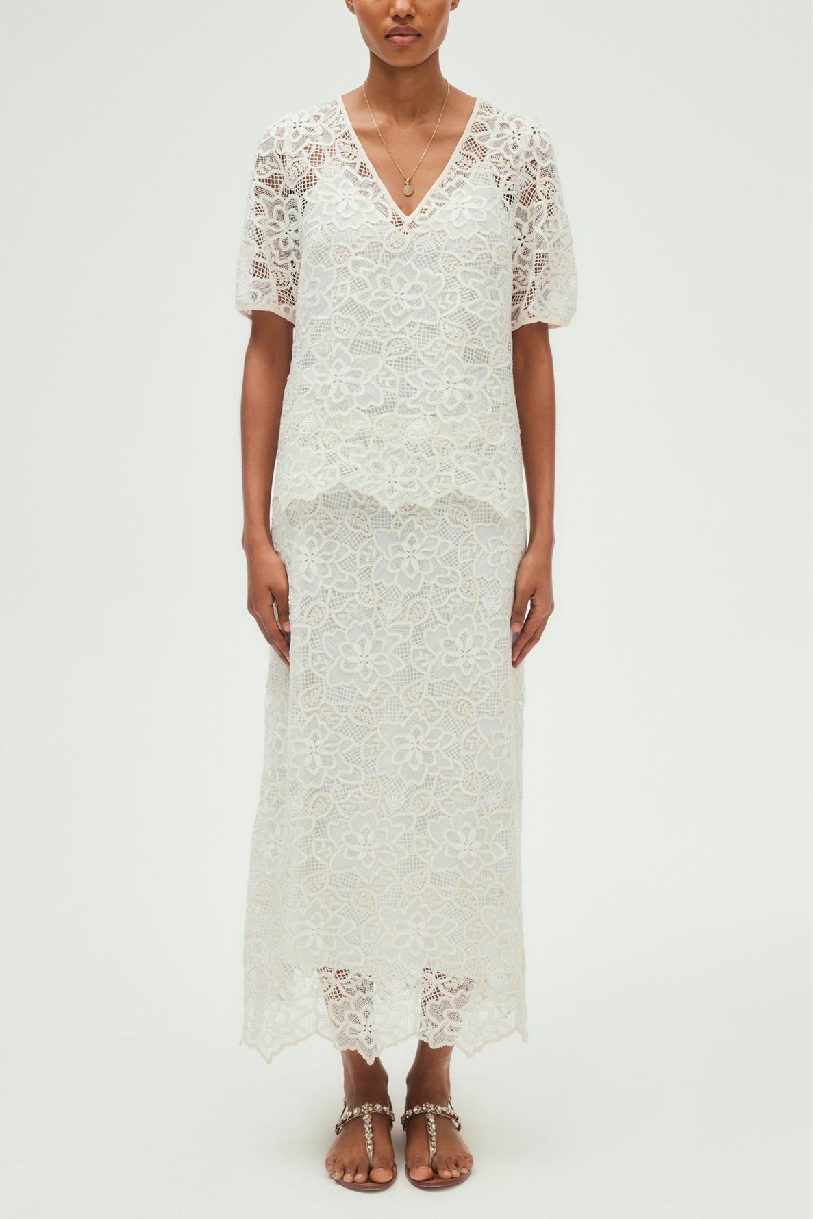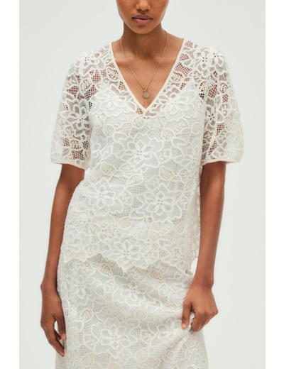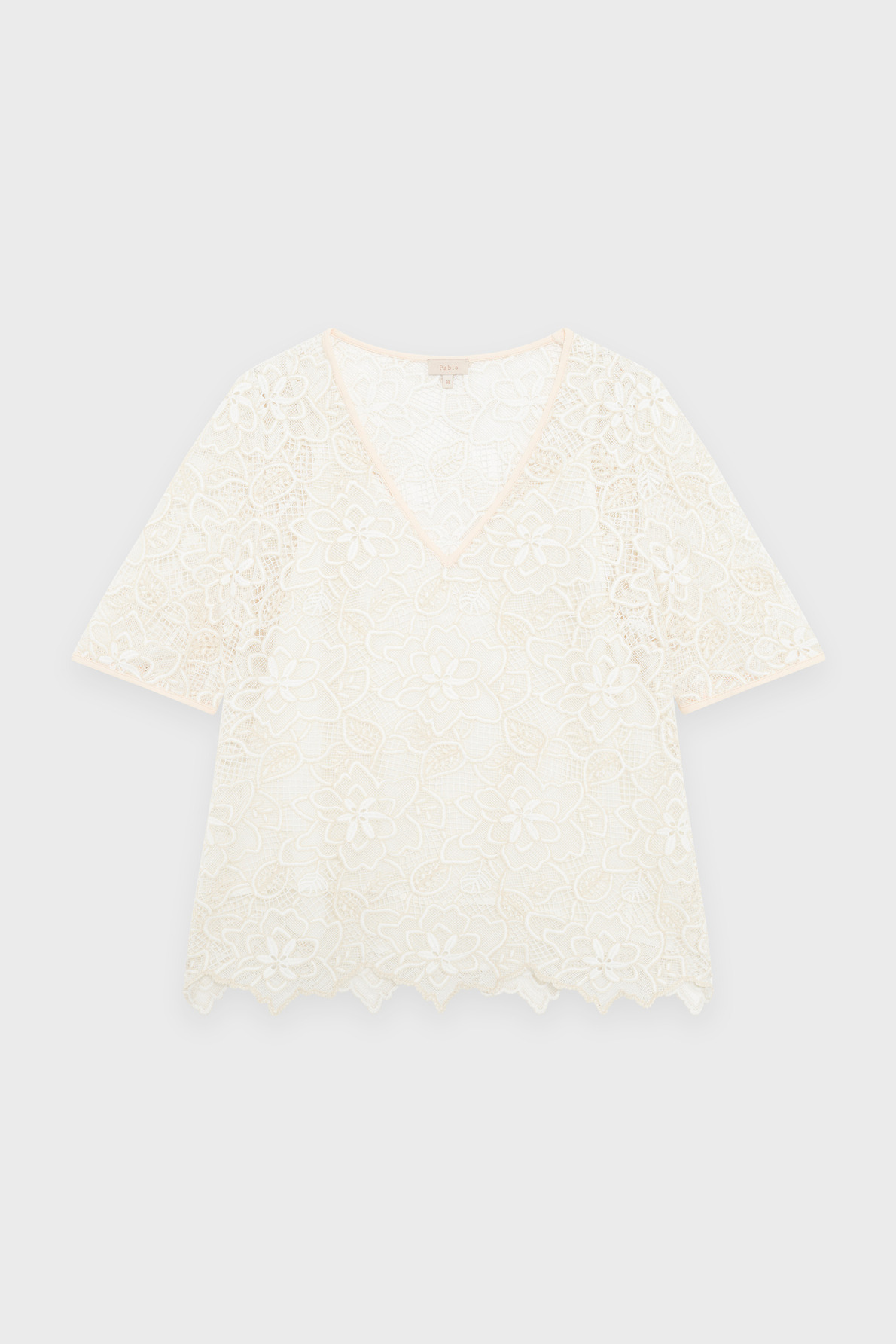 Forme droite, col V, manches courtes bouffantes avec plis aux épaules, motif floral brodé en broderie anglaise, bas dentelé. Matière légère et respirante, entretien facile.