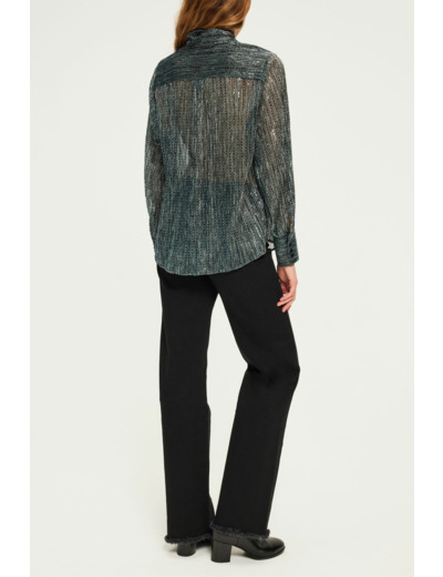 Confectionné dans un tissu à motif lurex, ce chemisier offre une silhouette droite et fluide, idéale pour un porté confortable et élégant. Son col lavallière apporte une note rétro raffinée tandis que l’effet de transparence délicat joue avec la lumière pour une allure féminine et audacieuse. Les manches longues se terminent par des poignets fermés par trois boutons ronds, soulignant le soin apporté aux détails.