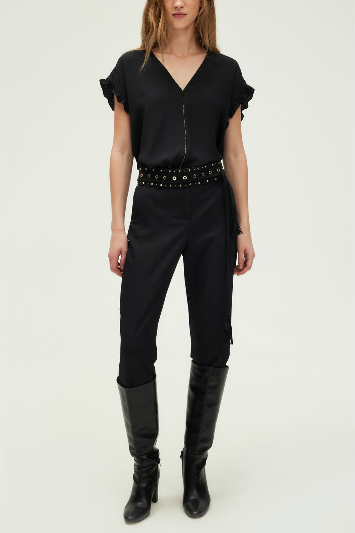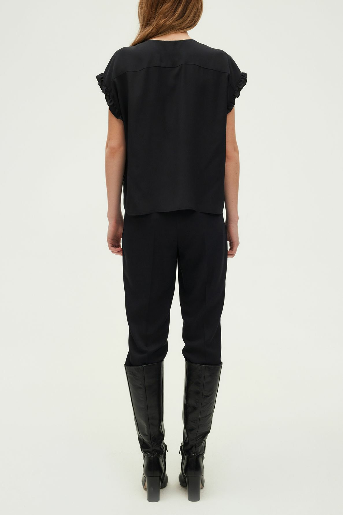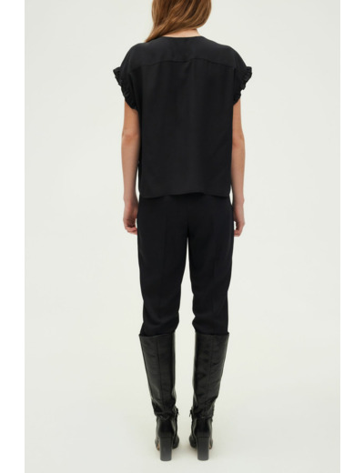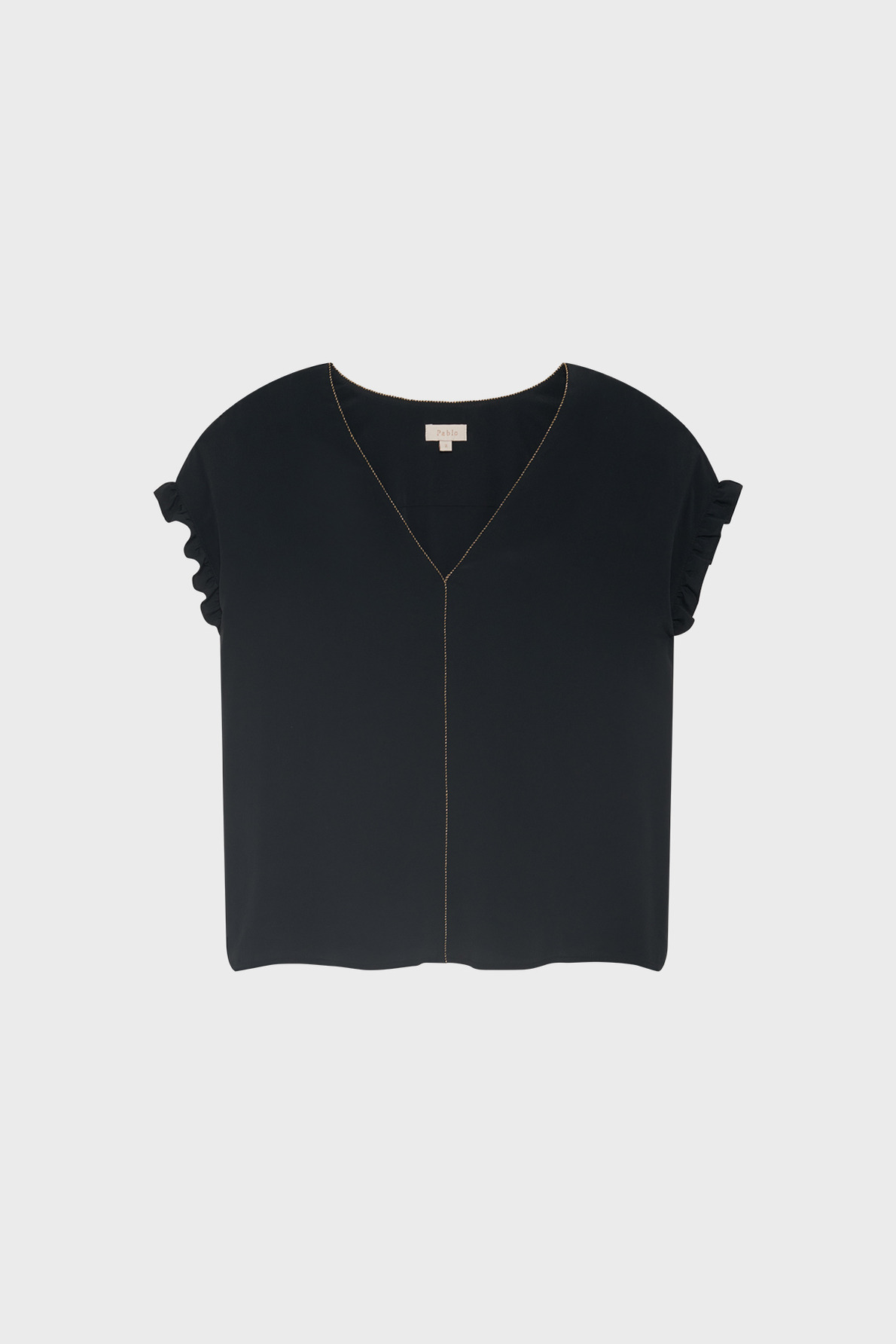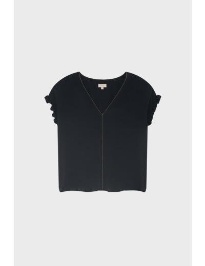 Top fluide avec galon doré dans un mélange contenant de la soie. Forme fluide, matière unie, col en V, manches courtes à petits volants.