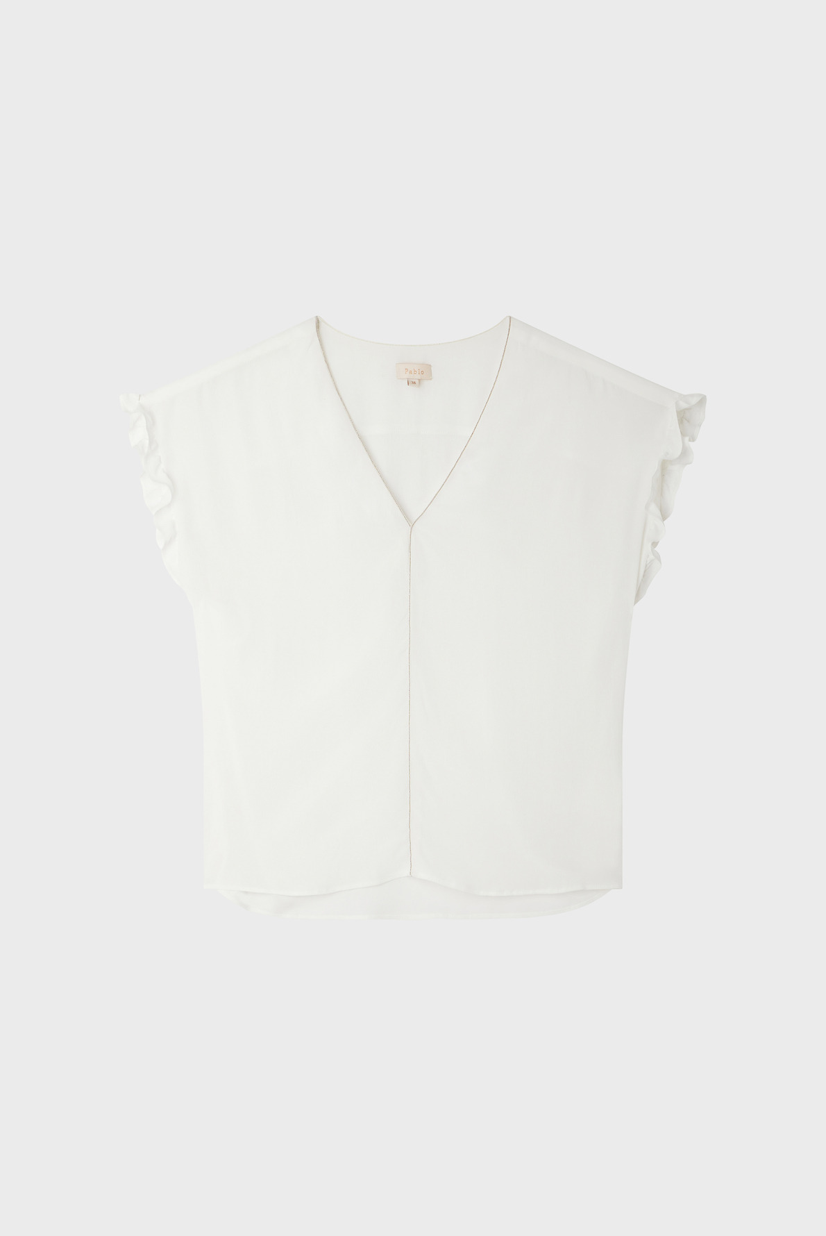 Cette chemise est réalisée dans une matière douce contenant de la soie, avec une forme droite fluide. Elle présente un col V, des manches courtes avec finitions volantées, ainsi qu’un empiècement au dos pour une meilleure tenue. La mannequin mesure 172 cm et porte une taille 38.