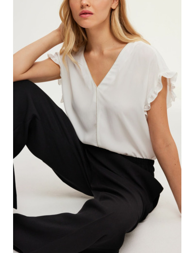 Conçue pour épouser la silhouette sans la contraindre, cette chemise à la coupe droite dévoile un col en V délicat et des manches courtes agrémentées de finitions volantées qui ajoutent du mouvement et de la féminité. L’empiècement au dos assure une tenue parfaite et une aisance naturelle, idéale pour accompagner vos looks du quotidien comme vos occasions spéciales.