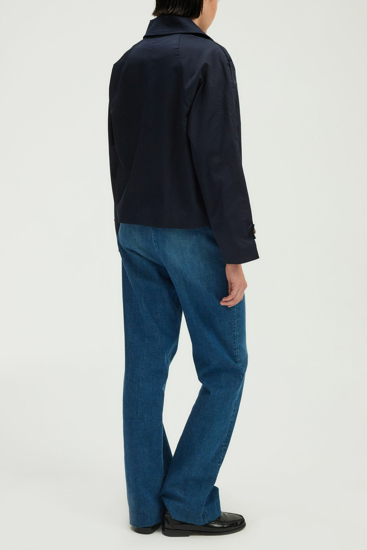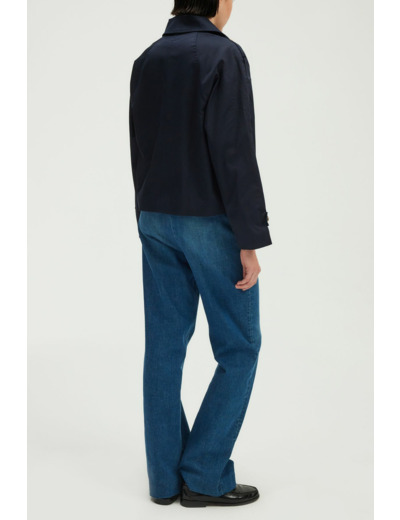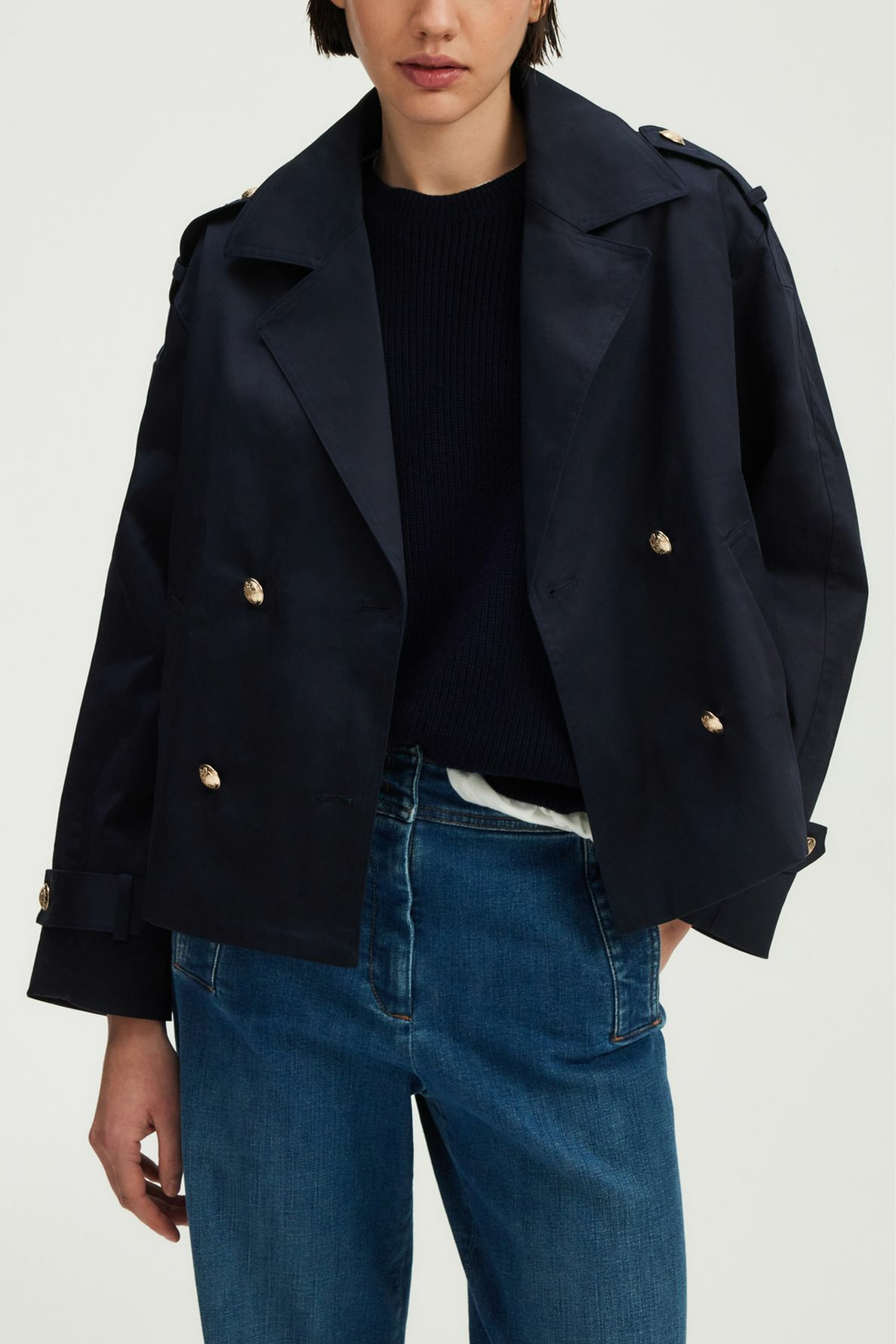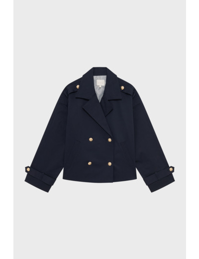 Trench court en coton uni, forme droite et volume ample. Boutonnage croisé avec boutons dorés gravés. Col tailleur, manches longues, poignets avec sangle et bouton doré. Poches passepoilées en biais à la taille. Sangle avec bouton doré aux épaules.