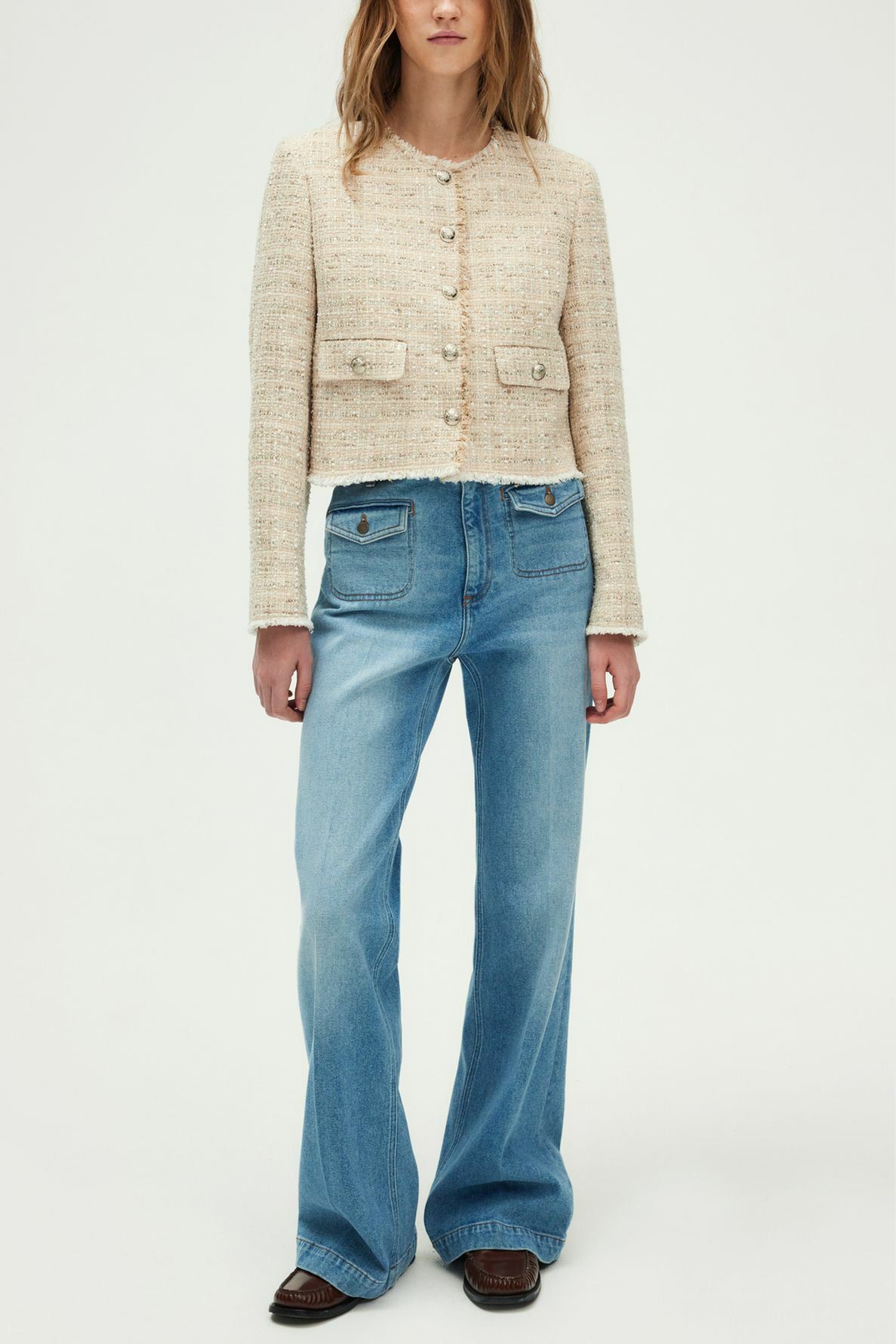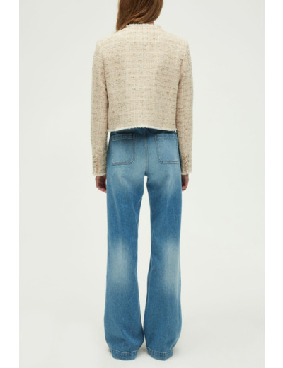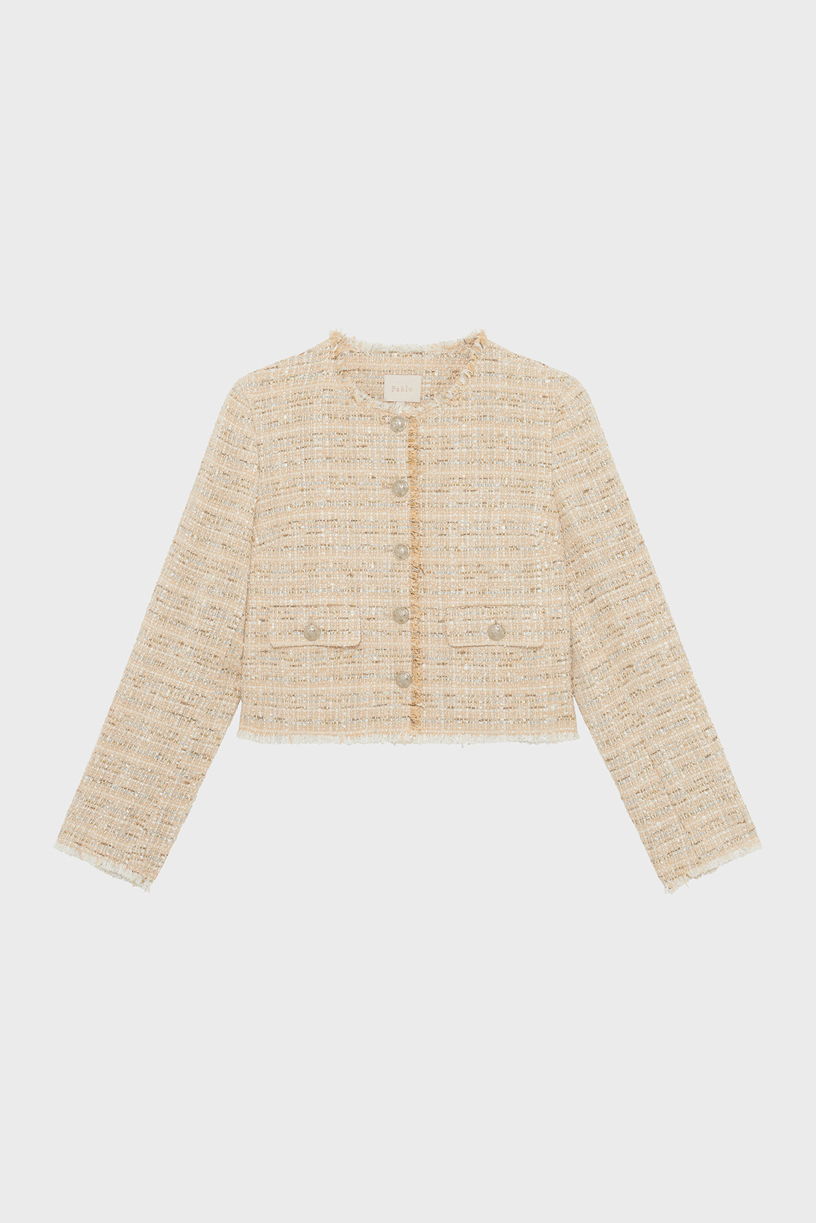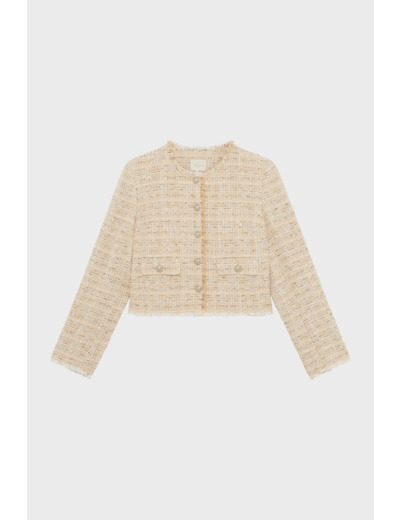 Forme droite, motif tweed avec lurex, veste courte sans col, manches longues, poignets fermés par trois boutons gravés, fermeture par boutons gravés sur le devant, poches à rabat avec bouton à la taille, finitions frangées.