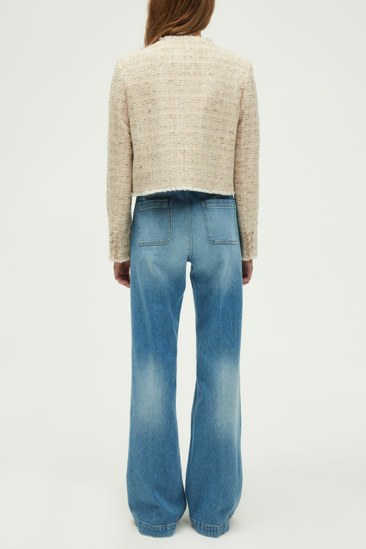 Conçue dans un motif tweed orné de fils de lurex, cette veste droite revisite les codes traditionnels avec des finitions frangées qui apportent du mouvement et du caractère. Sans col, elle mise sur une coupe épurée et des manches longues aux poignets fermés par trois boutons gravés, pour un look raffiné et maîtrisé. Les poches à rabat à la taille ajoutent une fonctionnalité discrète tout en soulignant la silhouette.