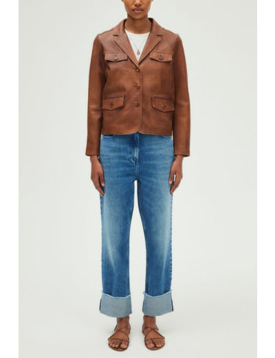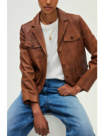 100% cuir vieilli, coupe cintrée, veste courte, col tailleur, manches longues, emmanchure classique, fermeture boutonnée, poches poitrine et taille avec rabat et bouton.