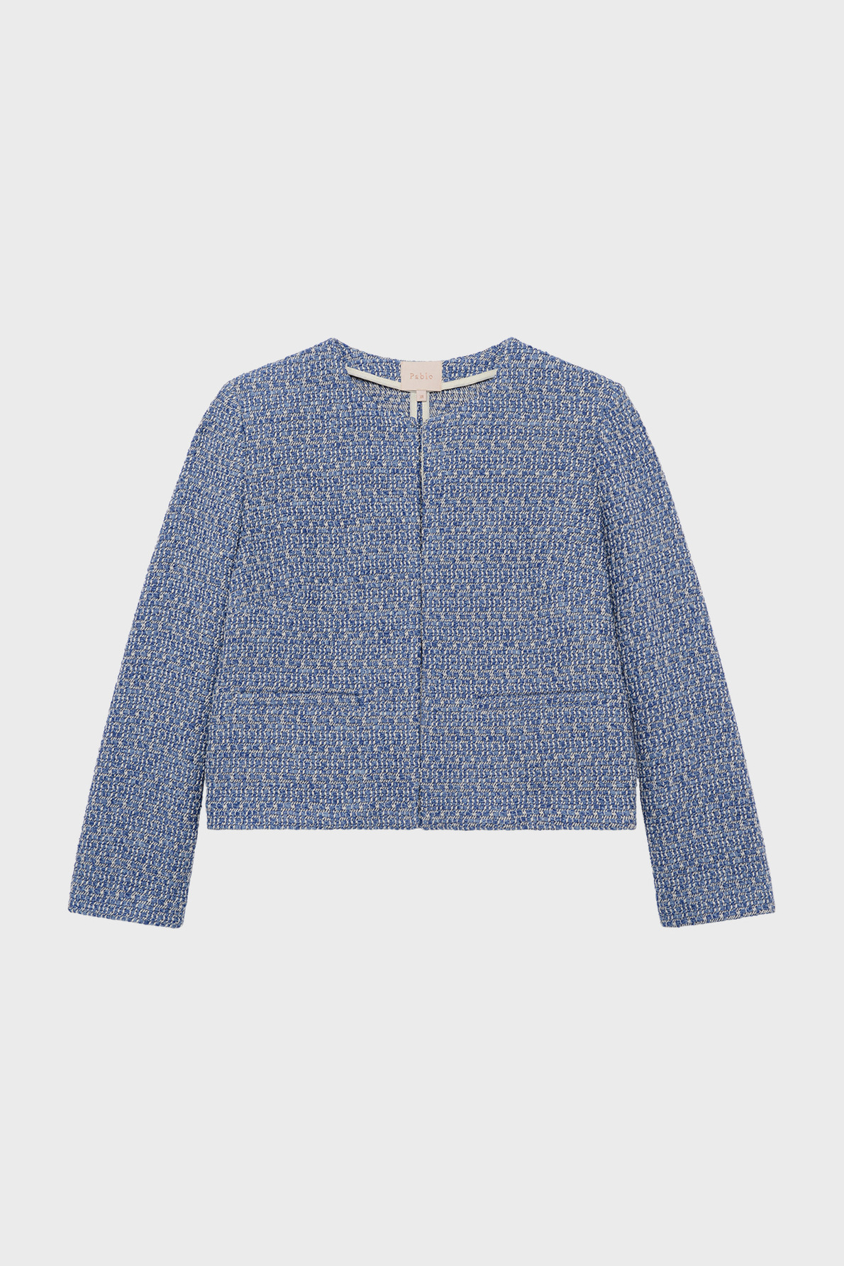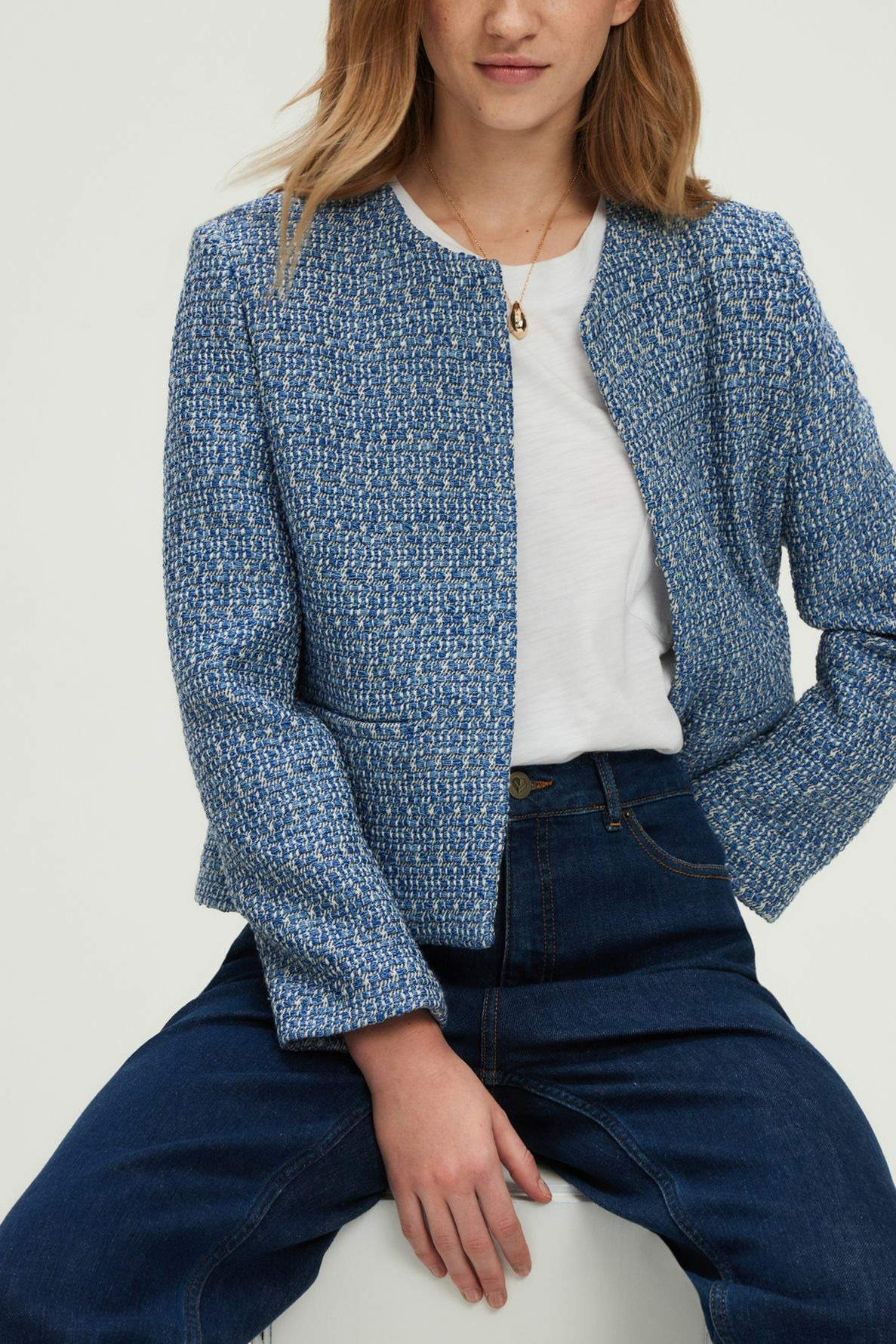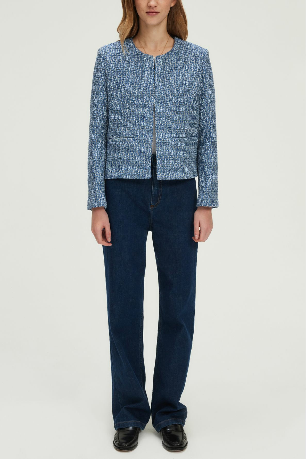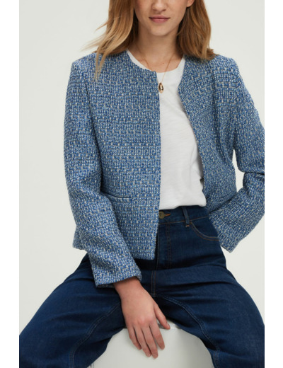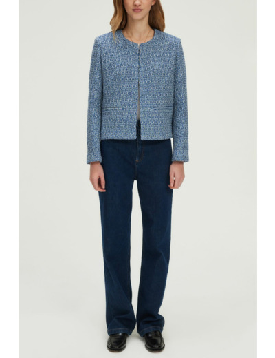 Forme droite, motif tweed bicolore bleu et blanc, veste courte sans col, manches longues, bord à bord avec une agrafe unique, poches plates passepoilées à la taille.