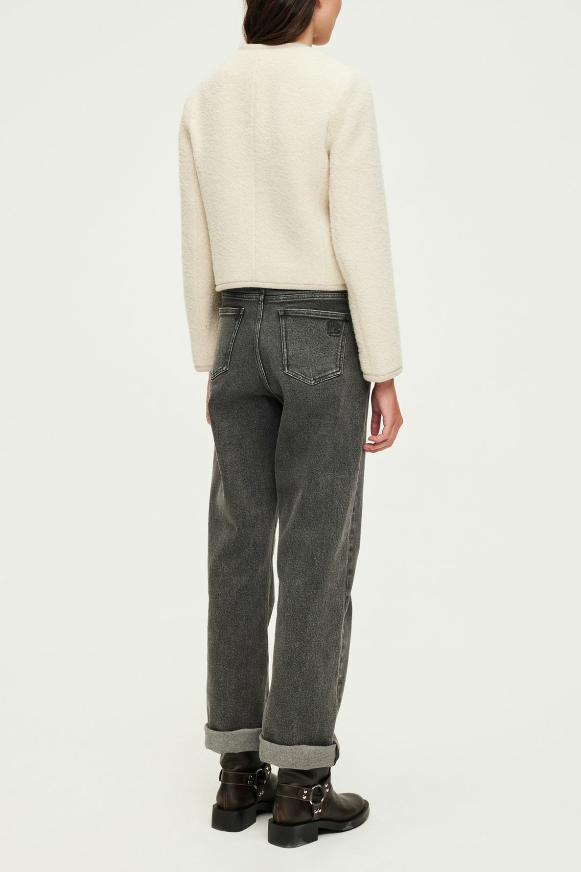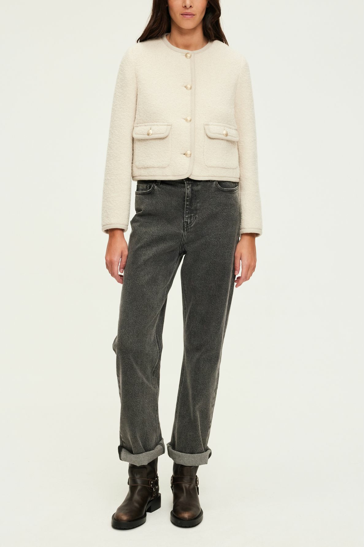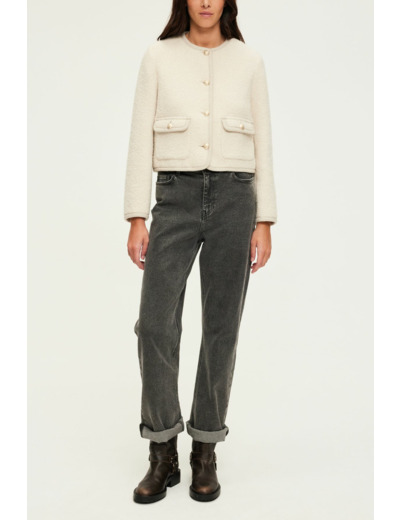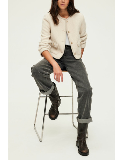 Forme droite, veste courte en tweed uni écru. Col rond, manches longues, emmanchure tailleur. Fermeture par boutons dorés gravés. Poches à rabat avec boutons assortis. Finitions gansées. La mannequin mesure 180 cm et porte une taille 38.