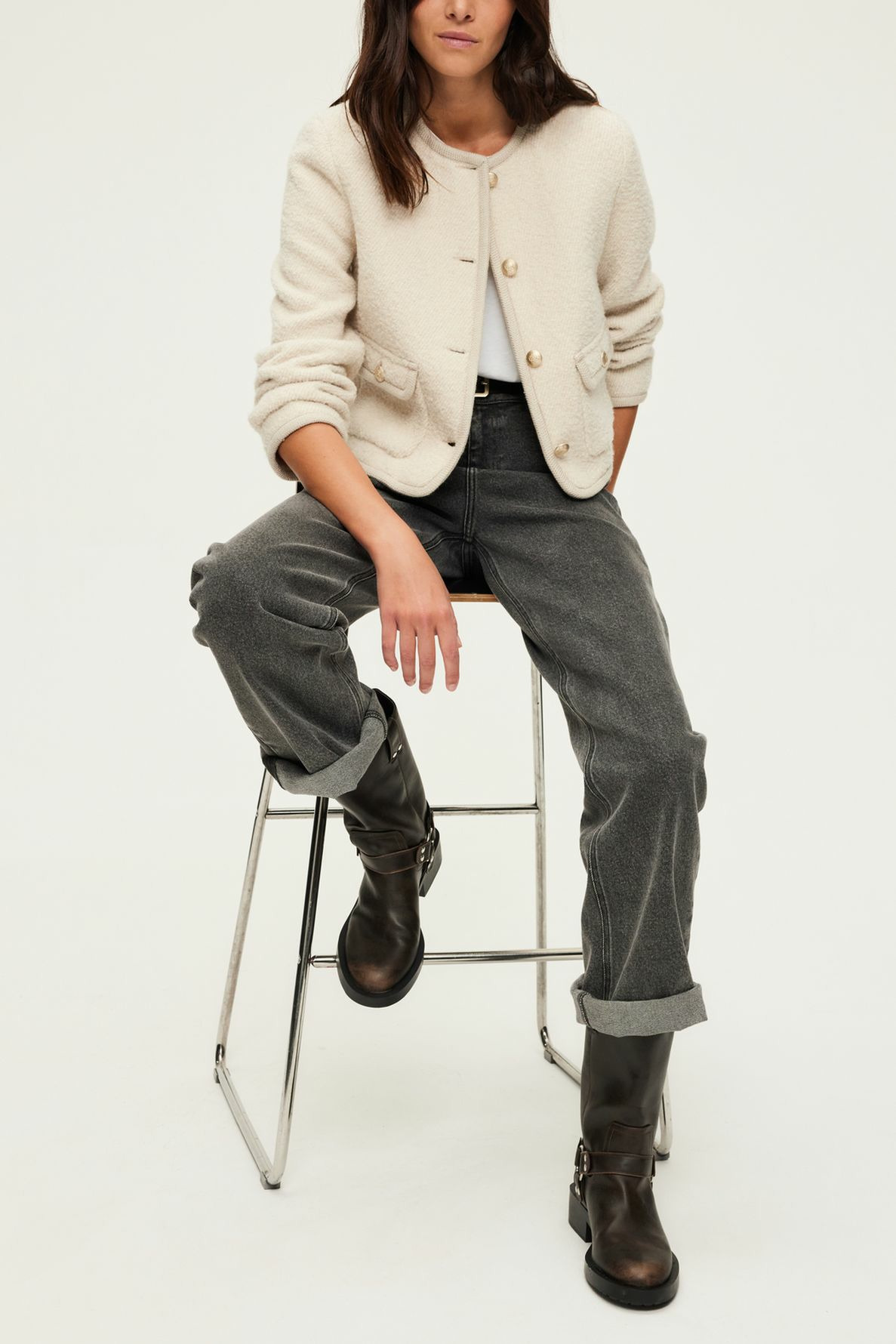 Affirmez votre style avec cette veste courte en tweed écru, un classique revisité pour une allure chic et contemporaine. Ses boutons dorés gravés apportent une touche d’élégance subtile, parfaite pour sublimer un jean ou une tenue plus sophistiquée.