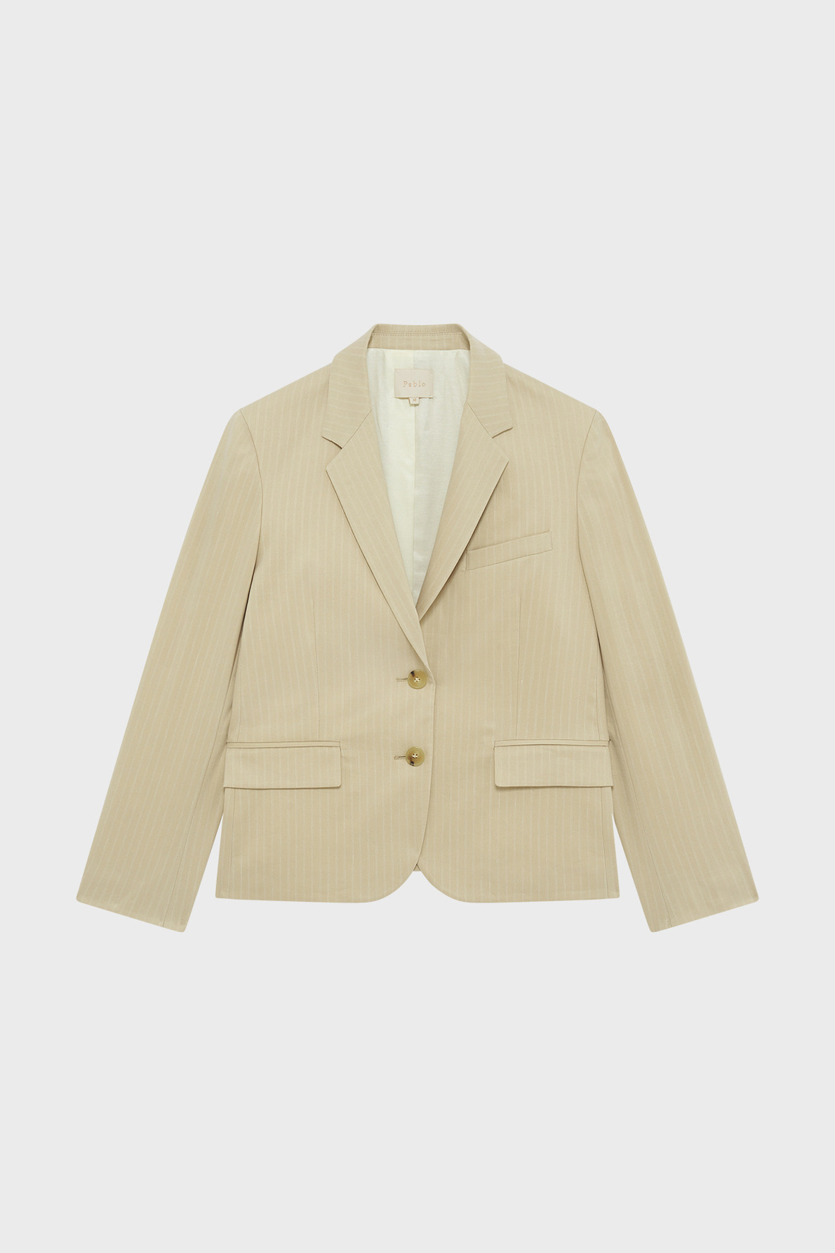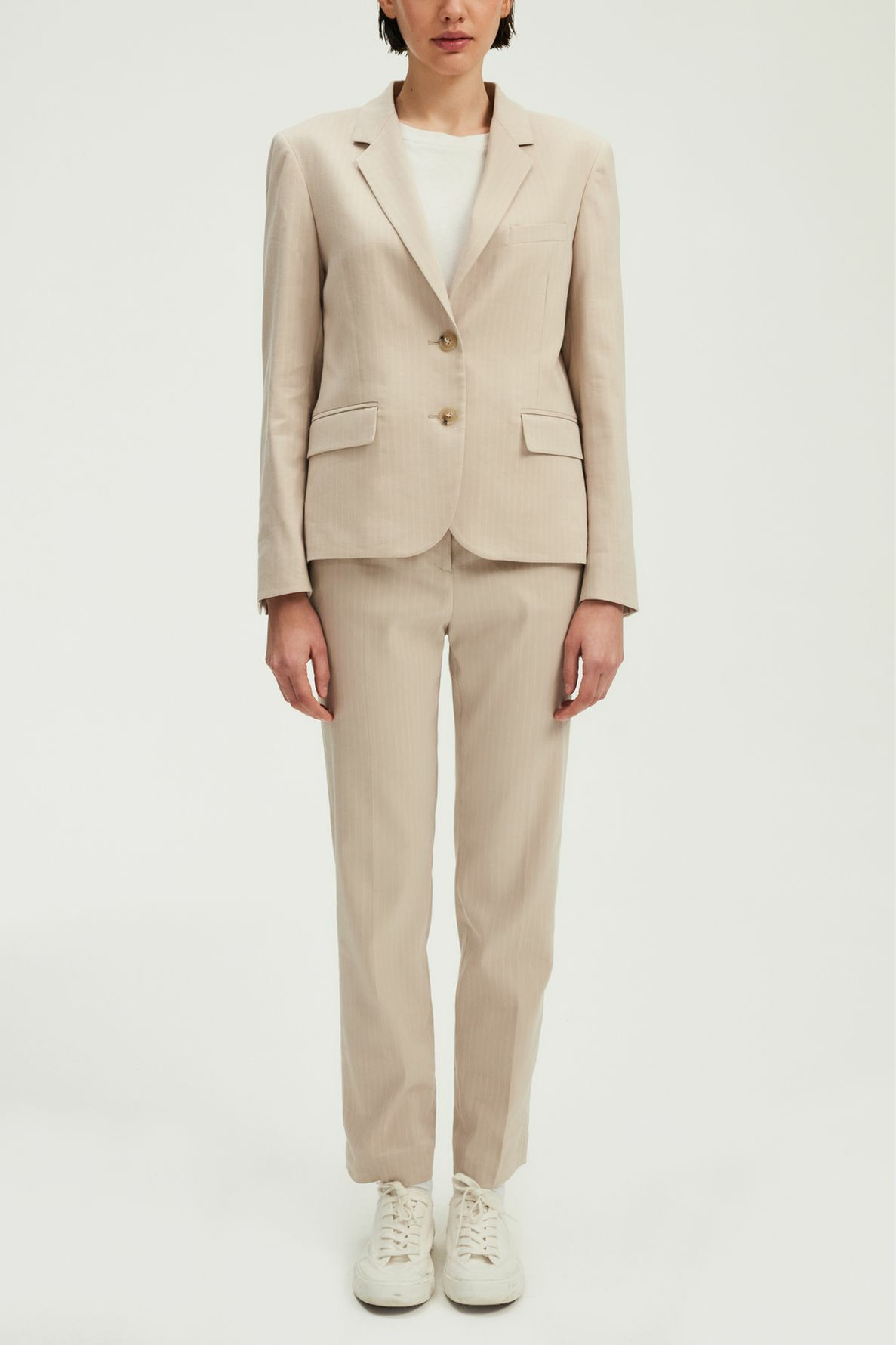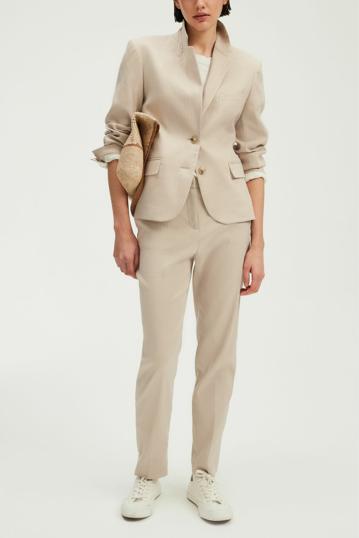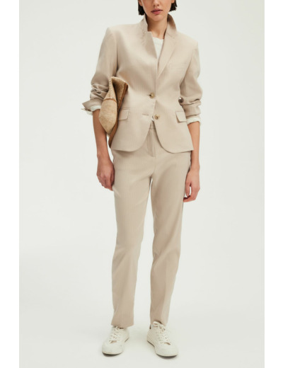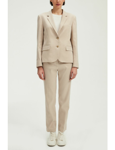 Forme droite légèrement cintrée, motif à rayures, longueur standard, emmanchure tailleur, col tailleur, manches longues avec bas de manches fermés par quatre boutons ronds, fermeture par deux boutons ronds, fente d’aisance au dos, poches passepoilées à rabat à la taille, une poche passepoilée à la poitrine. Pantalon assorti disponible.