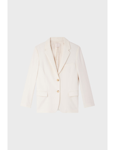 Réponse. La veste présente une forme droite avec un emmanchure et un col tailleur pour une silhouette structurée.