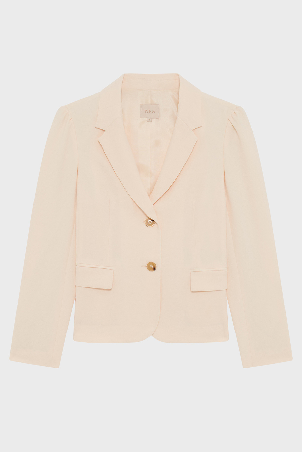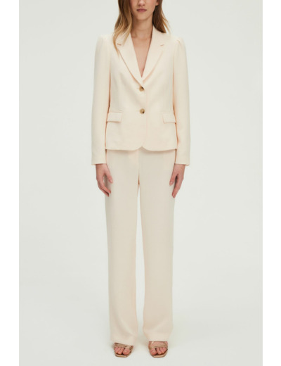 Forme droite, crêpe uni, veste courte avec emmanchure et col tailleur, manches longues, poignets fermés par quatre boutons ronds esprit corne, fermeture par deux boutons, poches à rabat, épaules froncées.