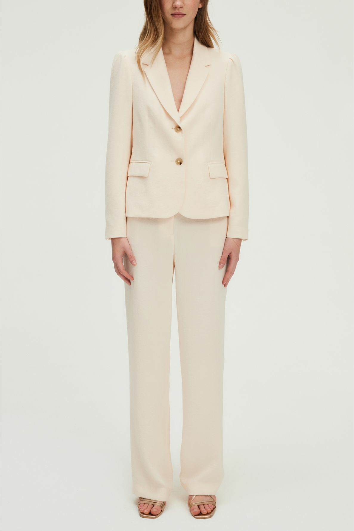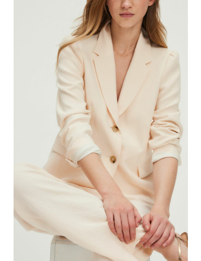 Sublimez votre allure avec cette veste en crêpe japonais nude, une pièce élégante et moderne qui s’impose par sa douceur et sa coupe impeccable. Parfaite pour un look tailleur raffiné ou une tenue casual chic.