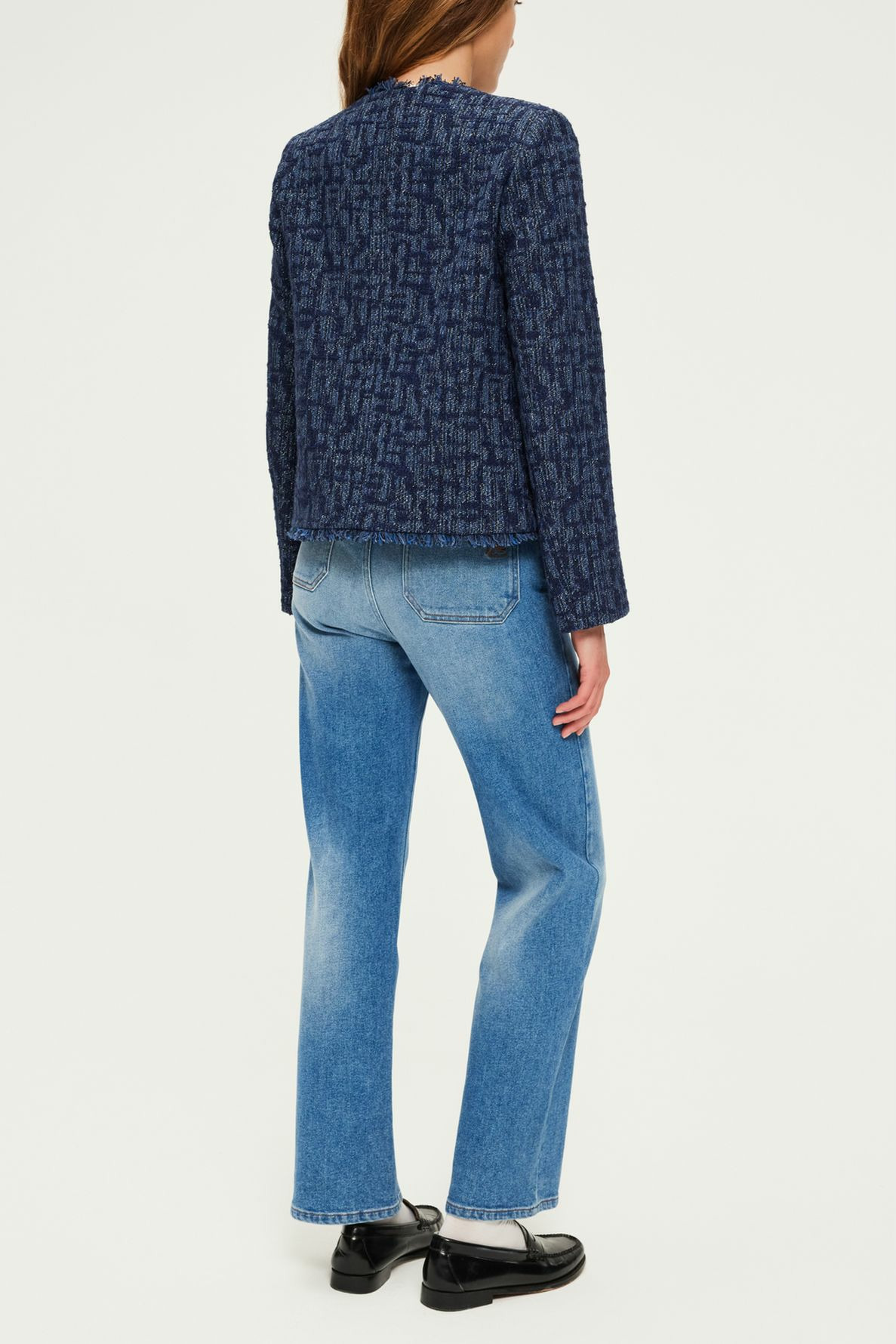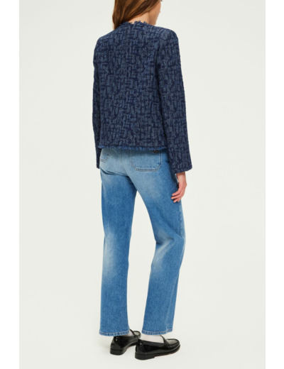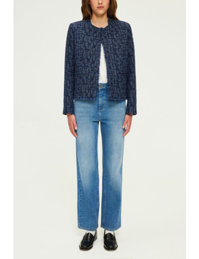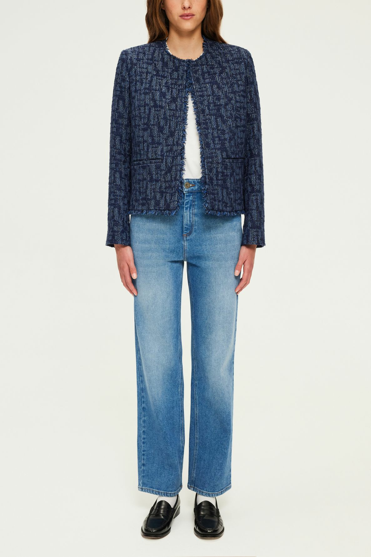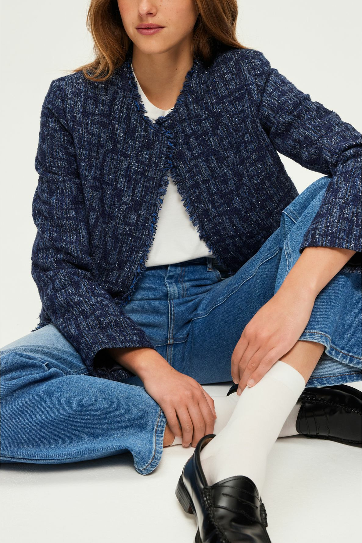 Forme droite, motif tweed, veste courte sans col, manches longues, emmanchure tailleur, bord à bord sans fermeture, poches plates passepoilées, finitions frangées. La mannequin mesure 174 cm et porte une taille 38.