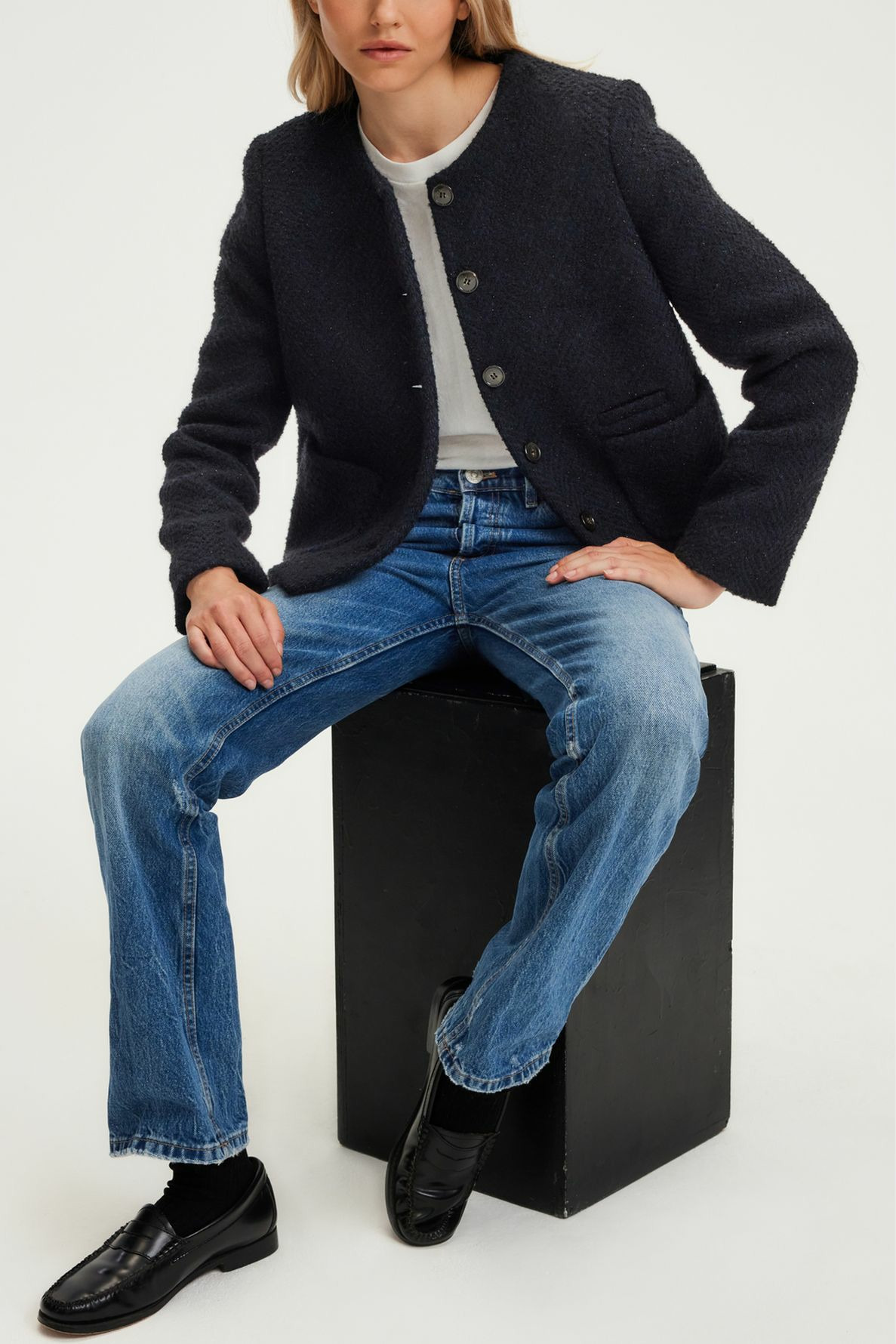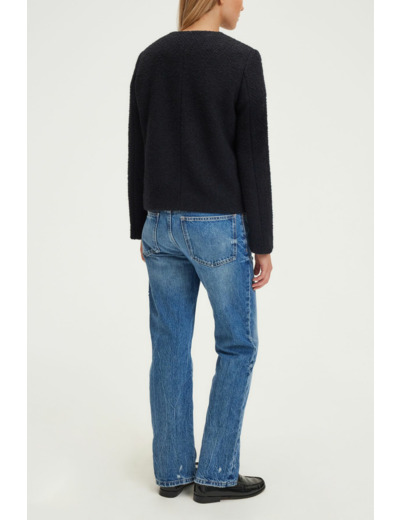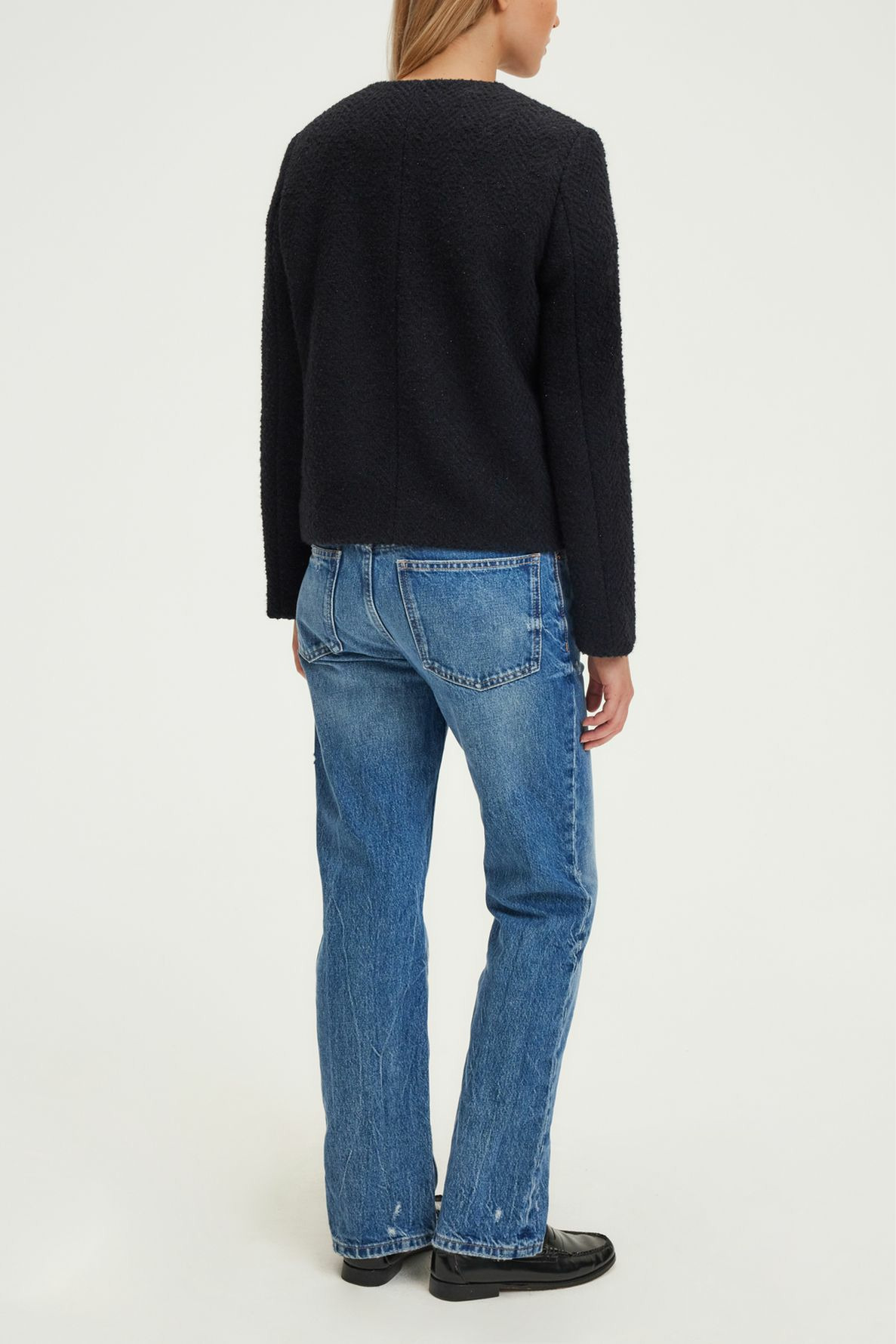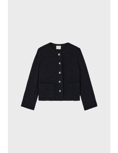 Forme droite, veste courte sans col, manches longues, fermeture par boutons ronds, motif tweed avec lurex, emmanchure tailleur, poches plates à la taille, petite poche passepoilée. La mannequin mesure 174 cm et porte une taille 38.