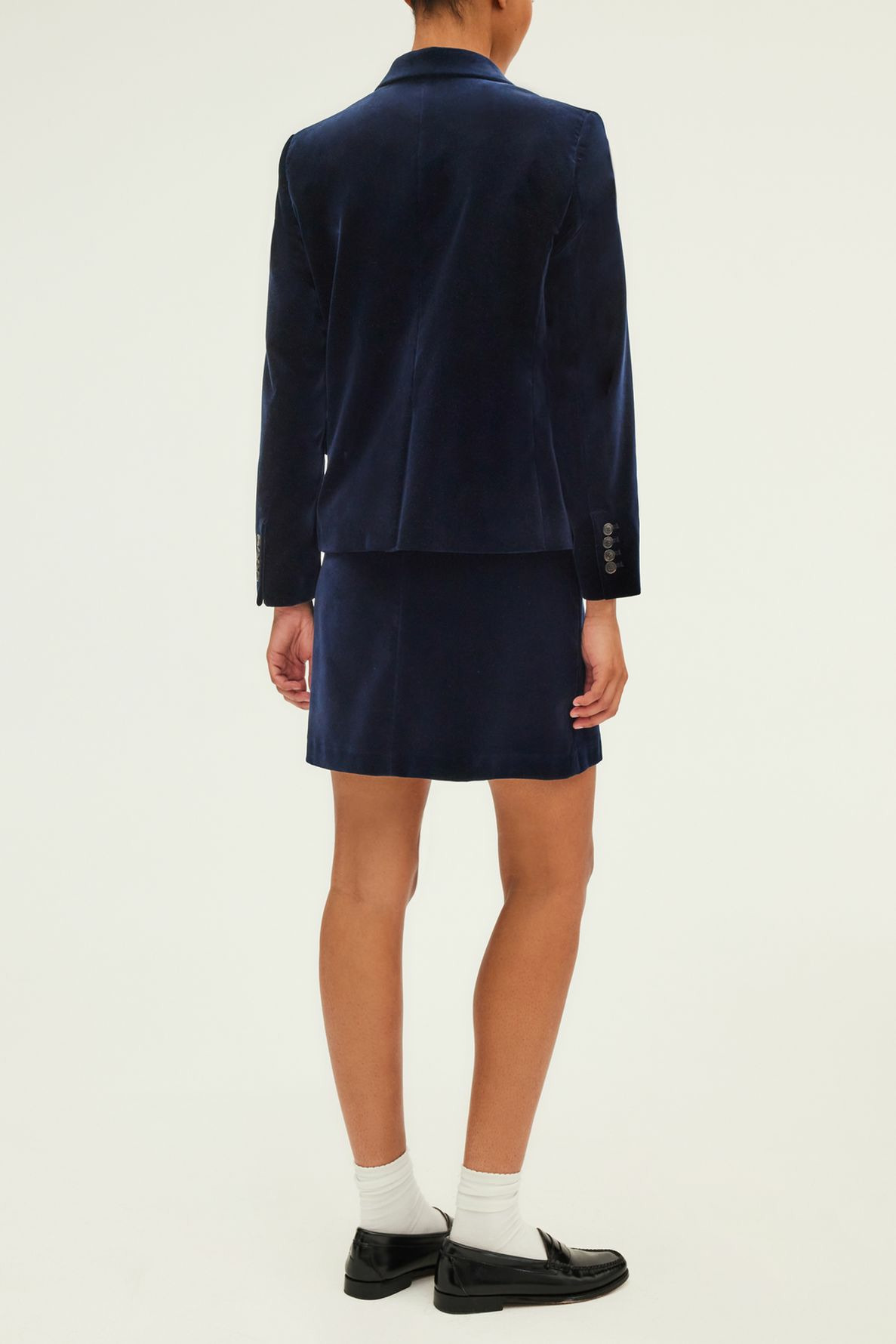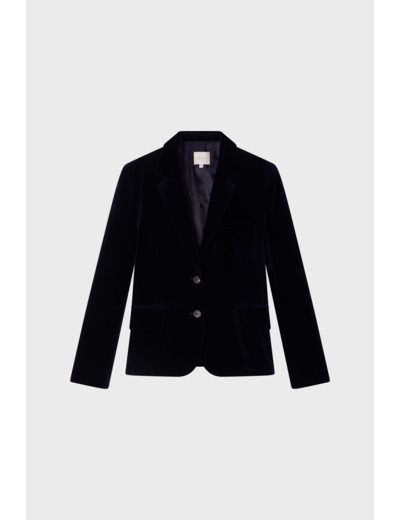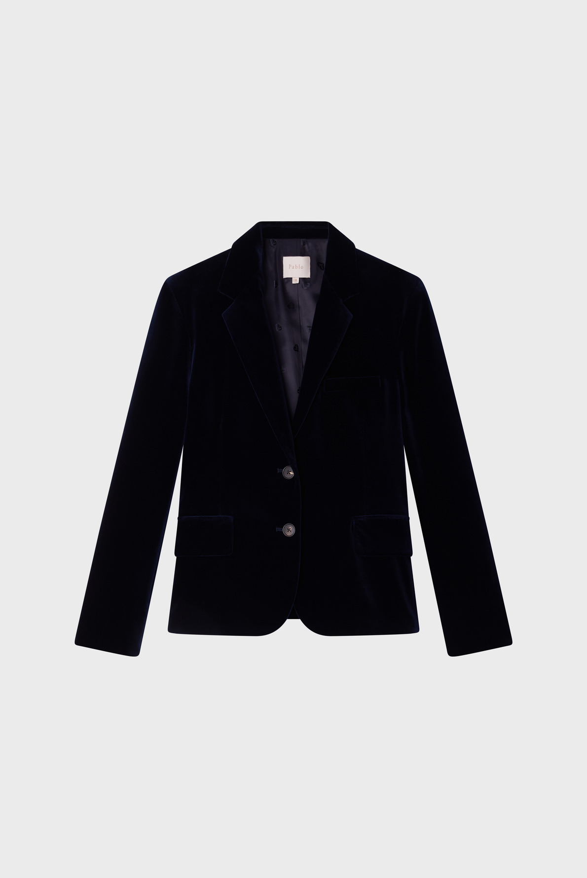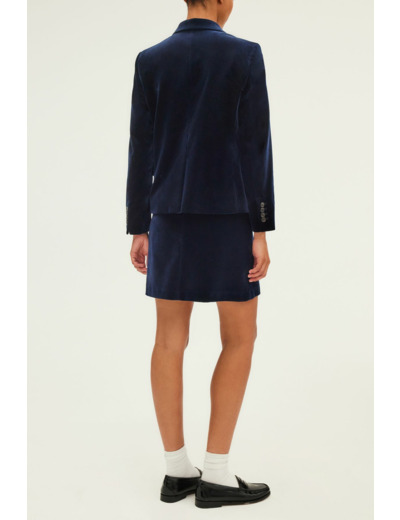 Forme droite, velours uni bleu marine, longueur standard, col et emmanchure tailleur, manches longues avec poignets fermés par quatre boutons, fermeture devant par deux boutons, fente d’aisance au dos, poches passepoilées à rabat sur les côtés et poche passepoilée à la poitrine. La mannequin mesure 180 cm et porte une taille 38.
