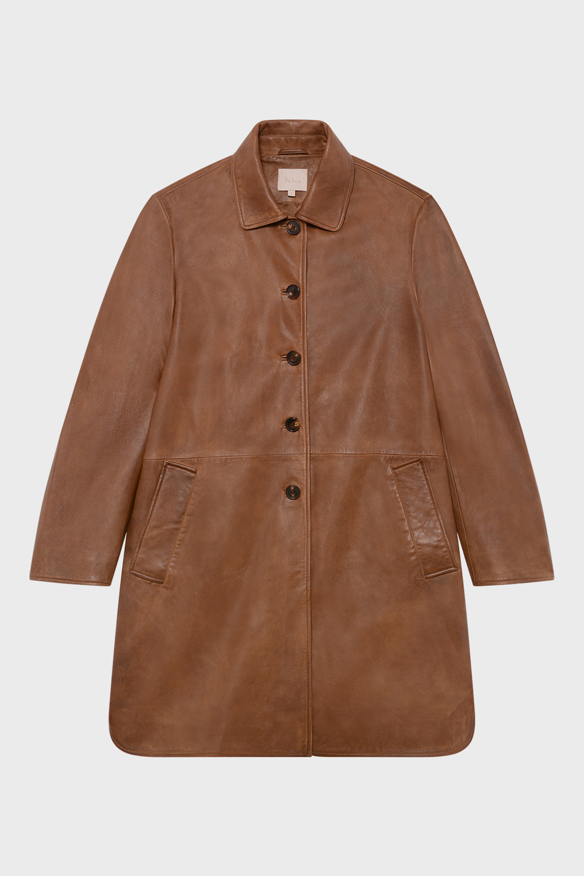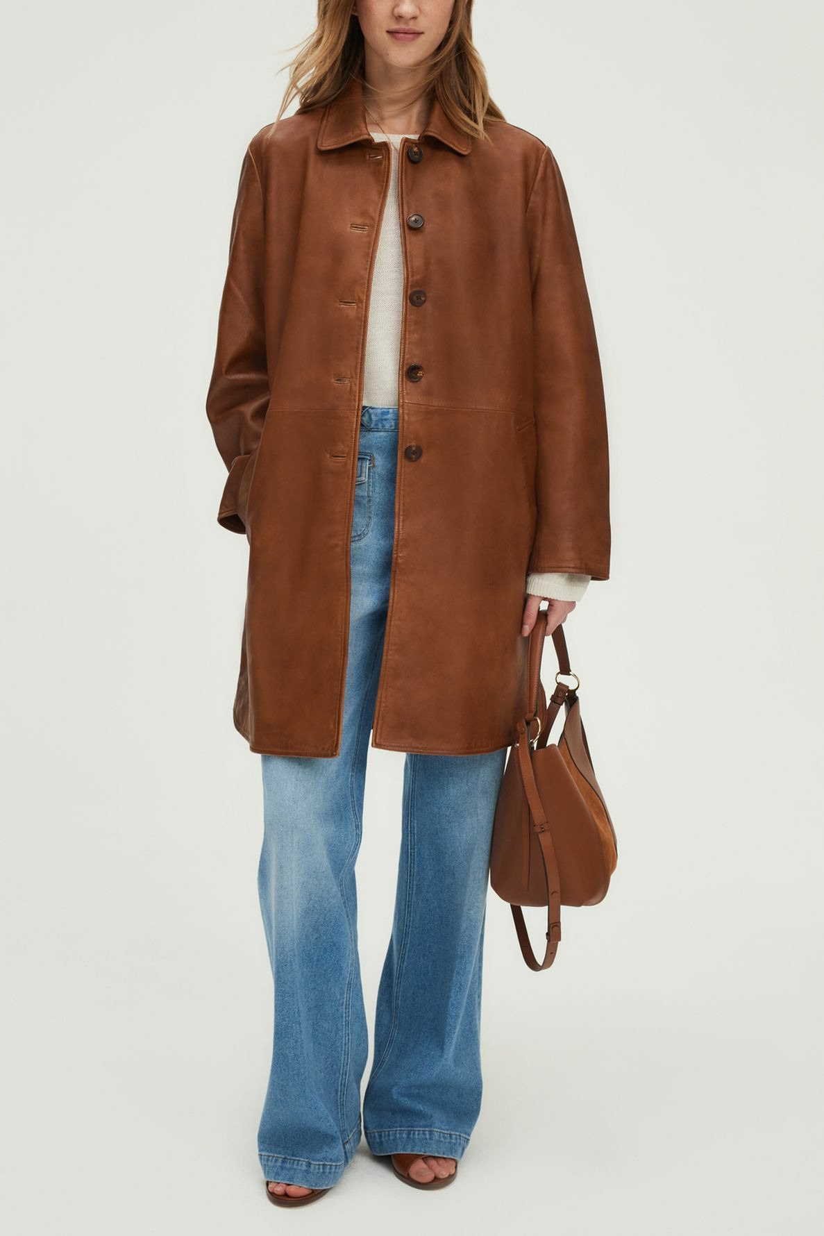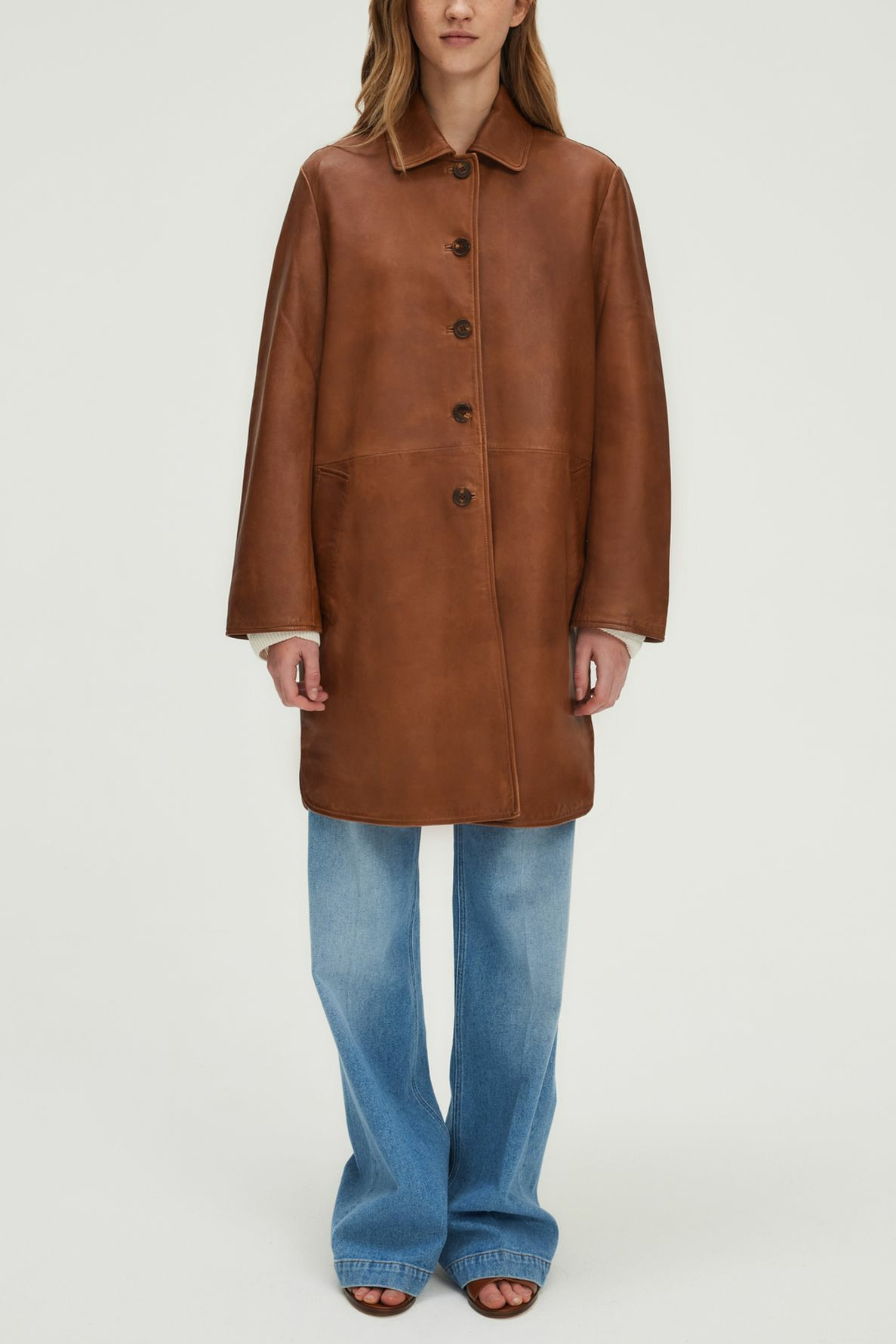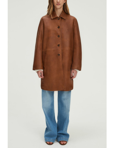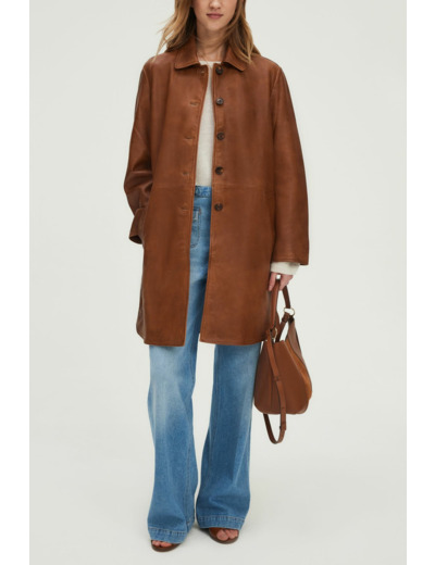 Veste longue en cuir d’agneau uni au toucher souple et aspect vieilli vintage. Coupe droite avec volume ample. Emmanchure classique, col chemise, manches longues. Fermeture par boutons ronds esprit corne. Poches passepoilées en biais.