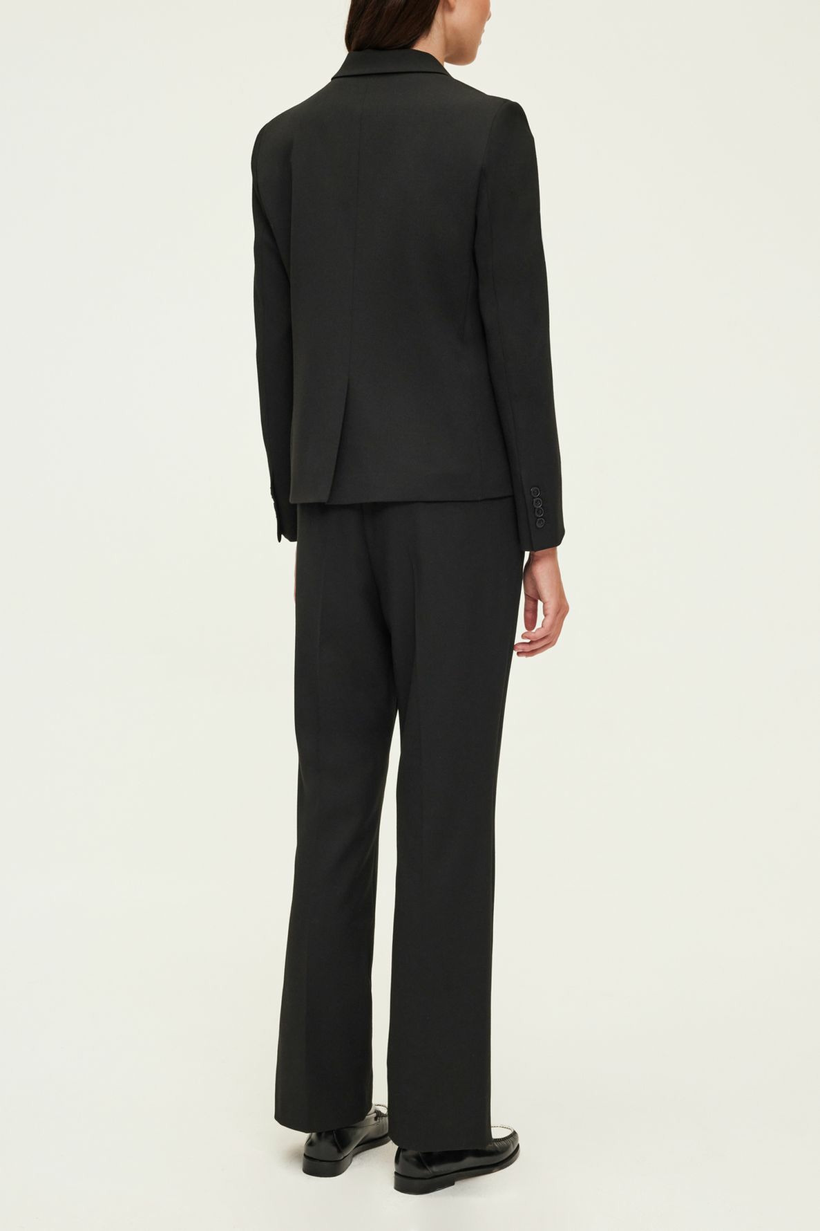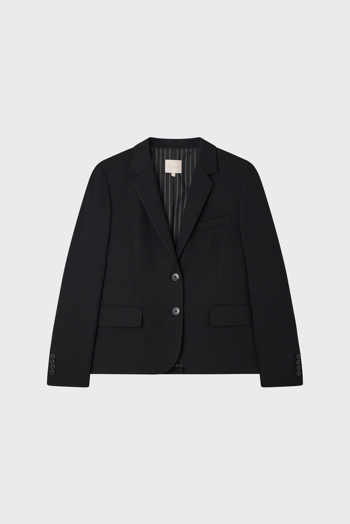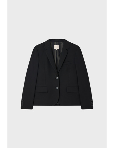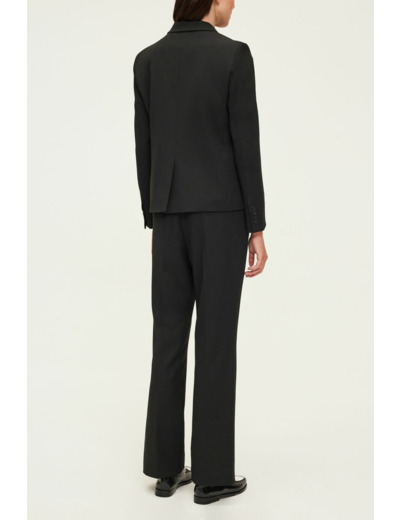 Forme droite, tissu uni, longueur standard. Emmanchure et col tailleur. Manches longues avec poignets fermés par quatre boutons. Fermeture devant par deux boutons. Fente d’aisance au dos. Poches passepoilées à rabat sur les côtés et poche passepoilée à la poitrine. La mannequin mesure 180 cm et porte une taille 38.