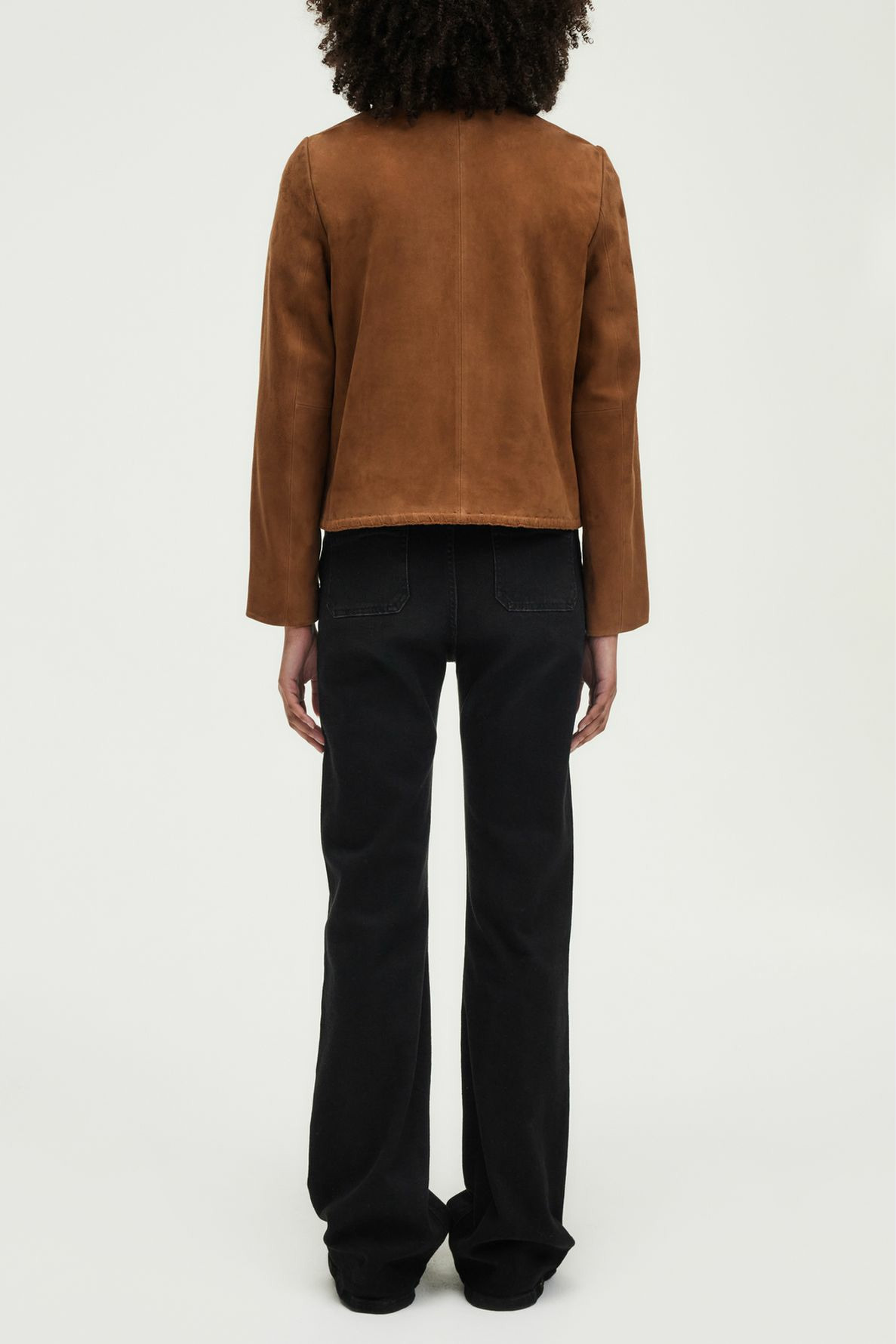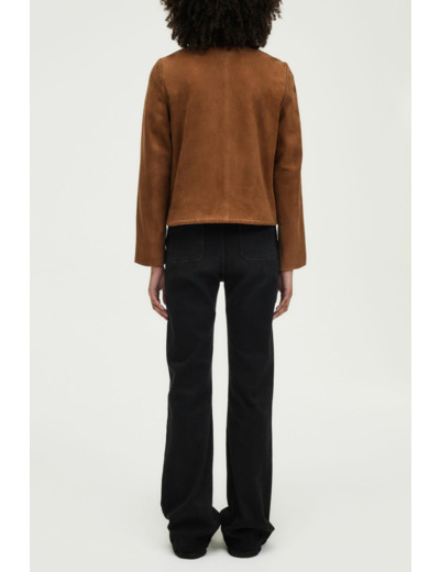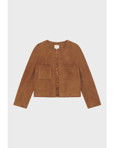 Forme droite, cuir velours uni, veste courte sans col, manches longues, bord à bord sans fermeture, deux grandes poches plates à la poitrine, cuir souple et doux au toucher.
