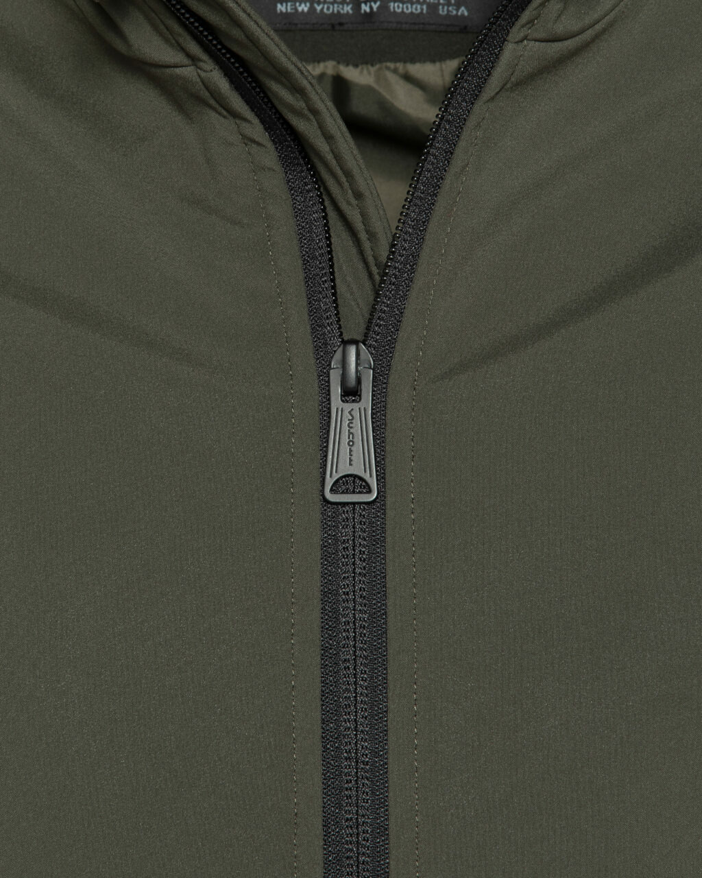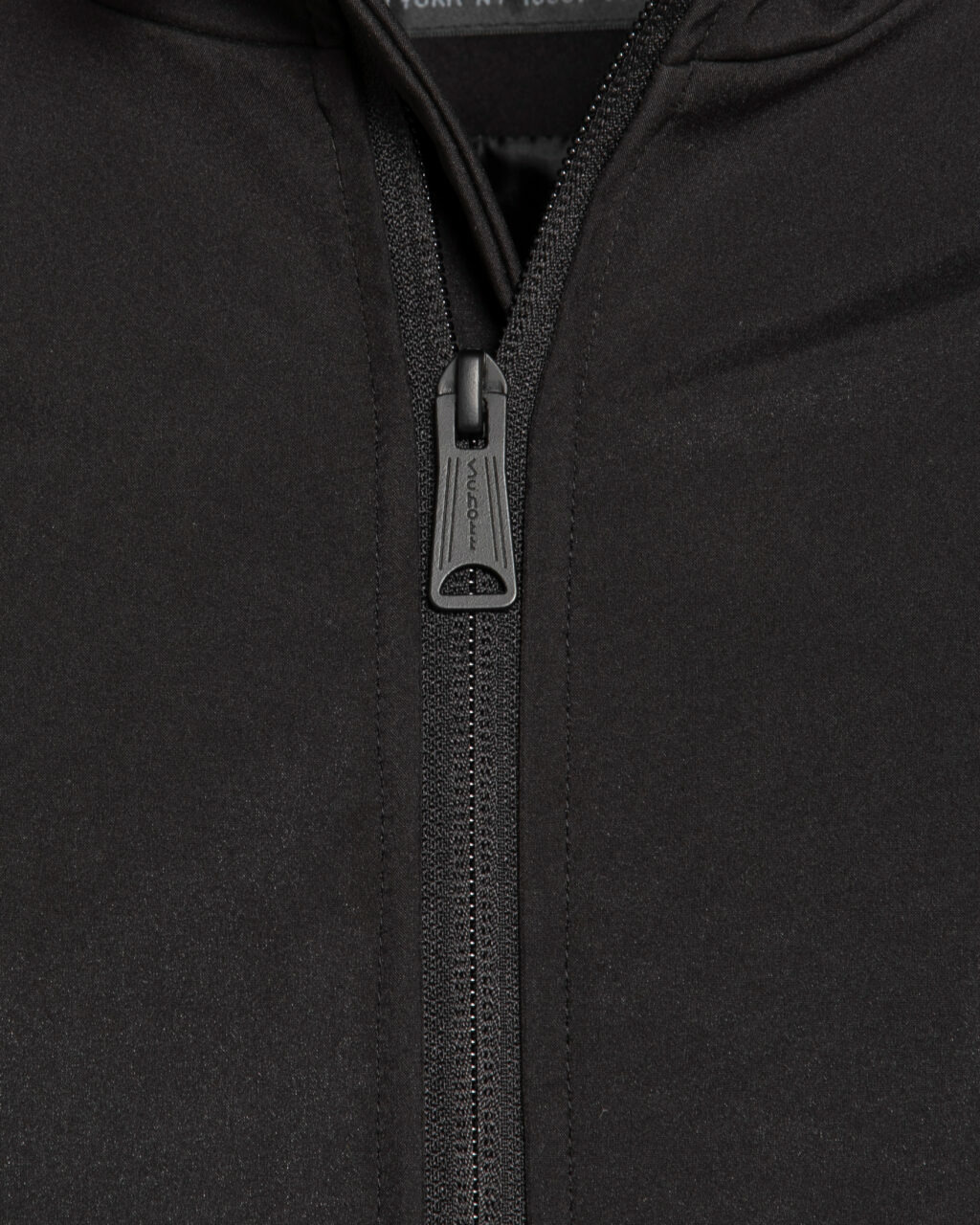 Réponse : Le col montant se ferme par zip, offrant une protection efficace contre le vent.