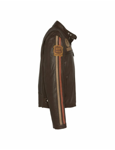 Fabriqué en 100 % cuir d’agneau avec doublure 100 % nylon et rembourrage 100 % polyester, il présente une coupe standard. Il comprend un col pressionné, une fermeture zippée, deux poches poitrine zippées, deux poches basses zippées, des badges sur poitrine et manches, des poignets zippés et pressionnés, ainsi que des sangles de serrage à la taille.