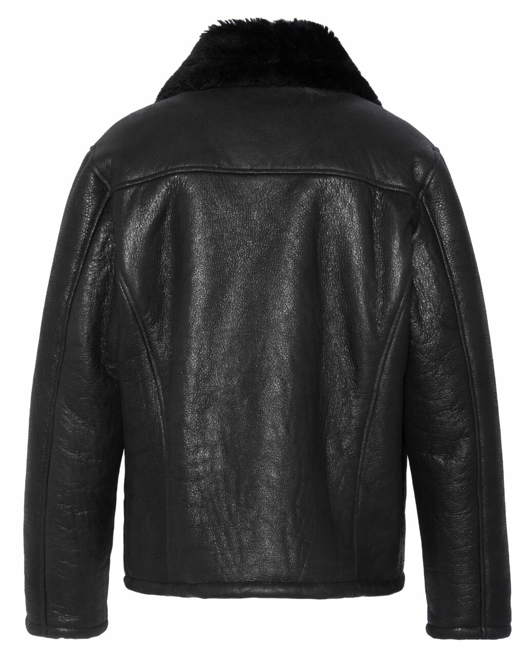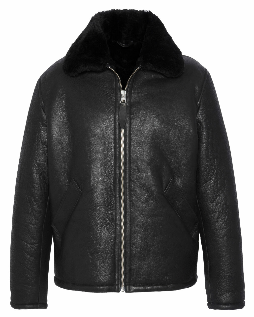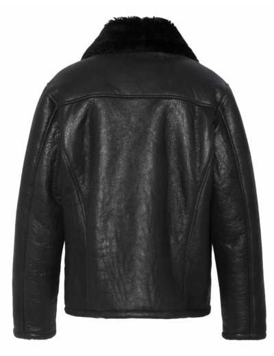 Bombardier hivernal en cuir de mouton double face, fermeture zippée centrale, deux poches basses, coupe standard.