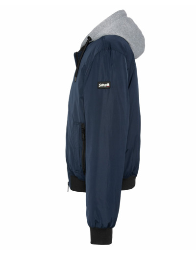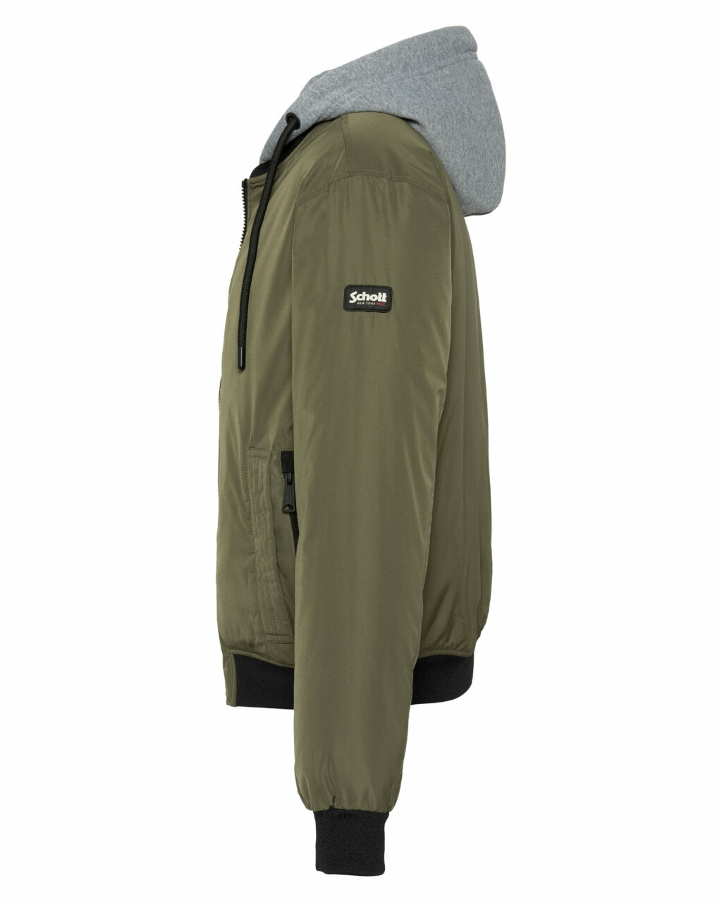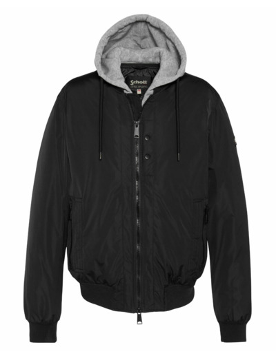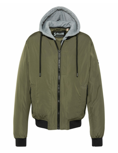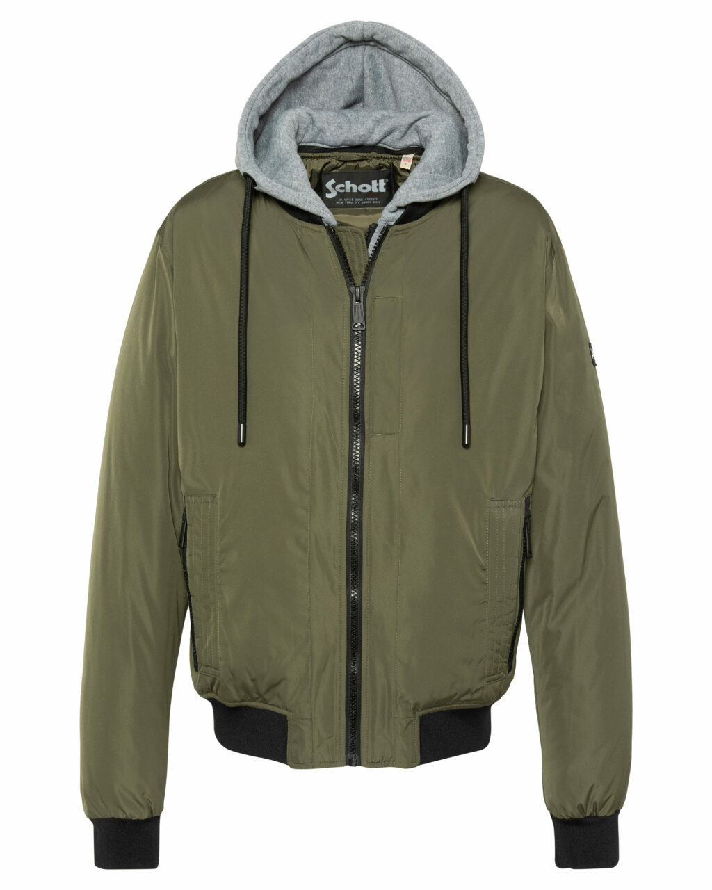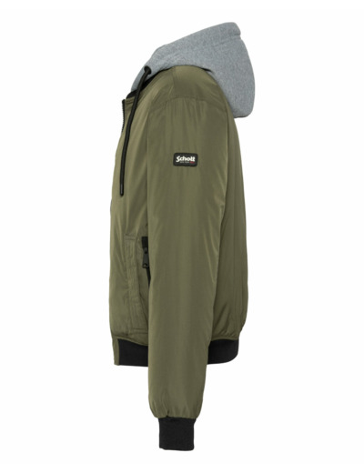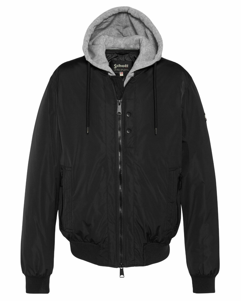 Fermeture centrale zippée solide, deux poches latérales zippées, une poche poitrine gauche, plastron avec capuche amovible, finitions en bord-côte au col, poignets et taille, logo Schott NYC brodé sur l’épaule gauche.