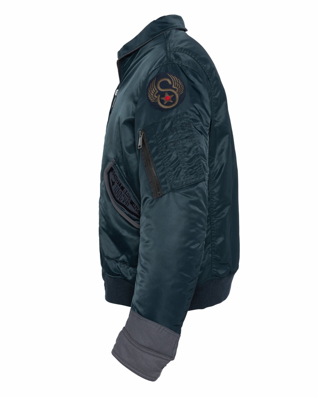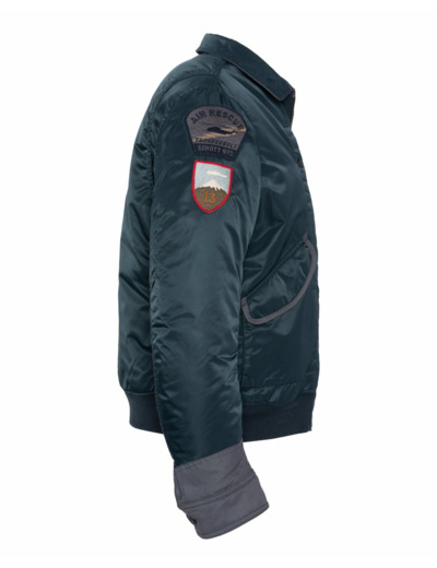 Ce bomber en nylon recyclé séduit par sa coupe courte resserrée à la taille et son tissu satiné résistant. Les patchs brodés « Air Rescue », « Thunderbolt » et « 100CV4 » rappellent les uniformes de l’US Air Force, tandis que le col chemise structuré et la doublure contrastante renforcent son caractère. Fonctionnel et stylé, il s’adapte parfaitement à un look urbain ou streetwear, à porter avec un jean brut ou un pantalon cargo.