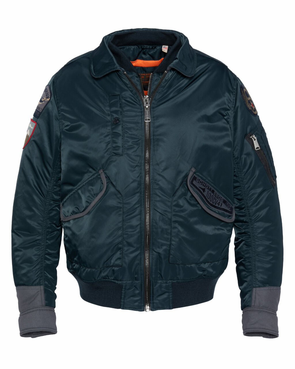Le bomber 210VINTRS dispose d’une fermeture zippée centrale, de deux poches extérieures à rabat pressionné, d’une poche zippée sur la manche gauche, ainsi que d’une poche poitrine à bouton pression. Le logo Schott NYC est discrètement intégré aux patchs, signe d’une finition soignée et cohérente.