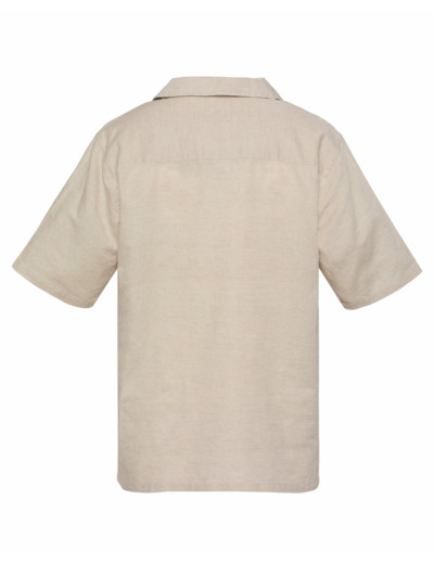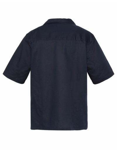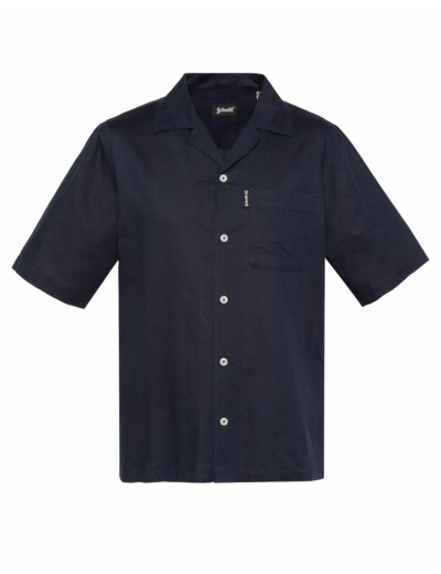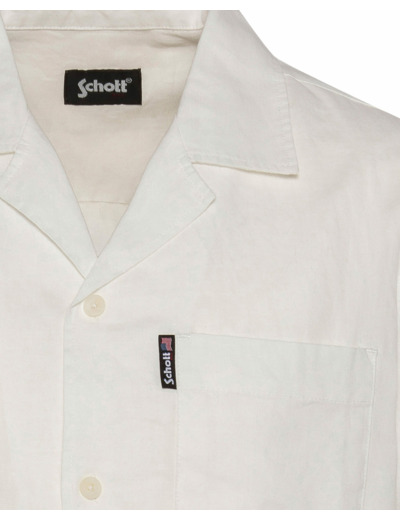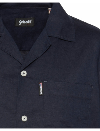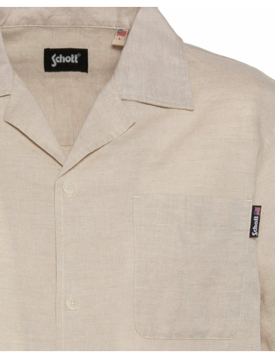 Matière : 55 % lin, 45 % coton. Manches courtes, col ouvert, fermeture boutonnée. Poche poitrine plaquée avec étiquette Schott NYC.
