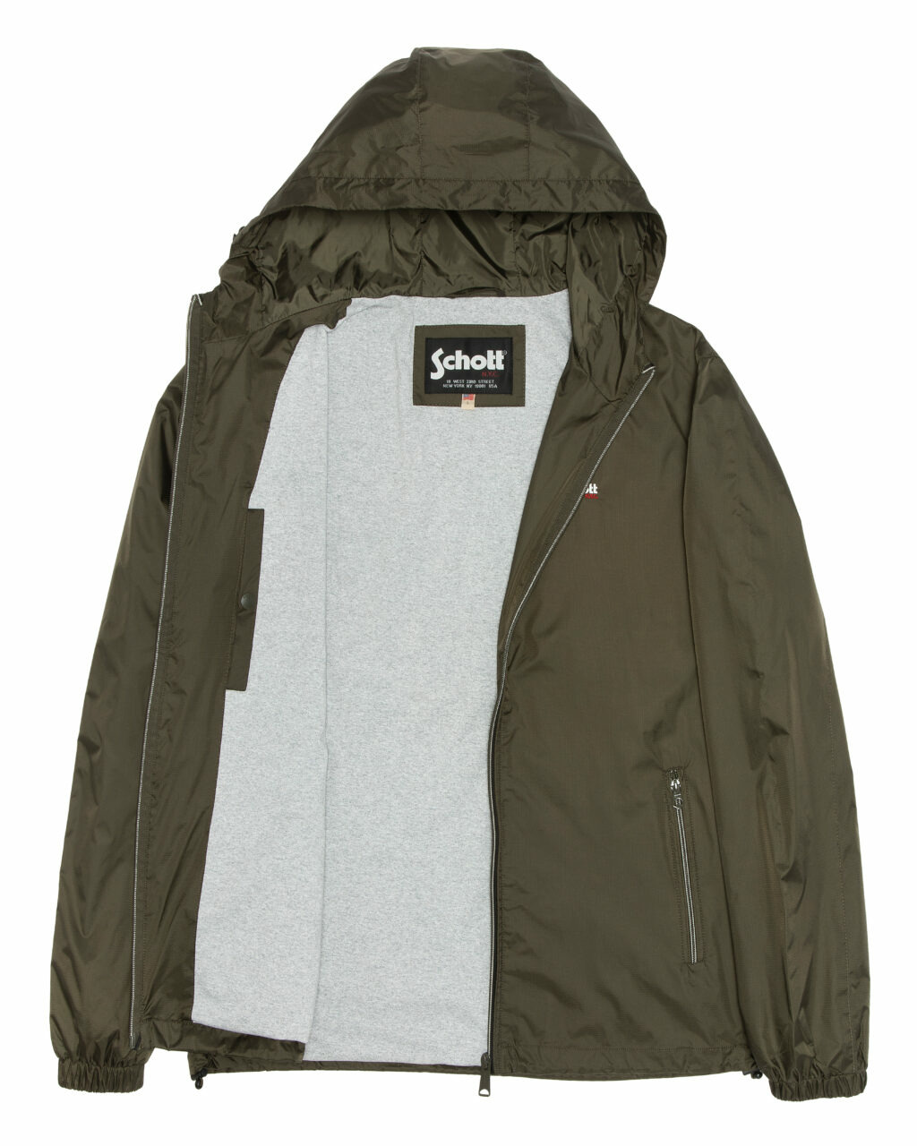 Matière déperlante, fermeture zippée, deux poches latérales zippées, capuche avec cordon de serrage, poignets et taille élastiqués, logo Schott NYC brodé sur la poitrine gauche.