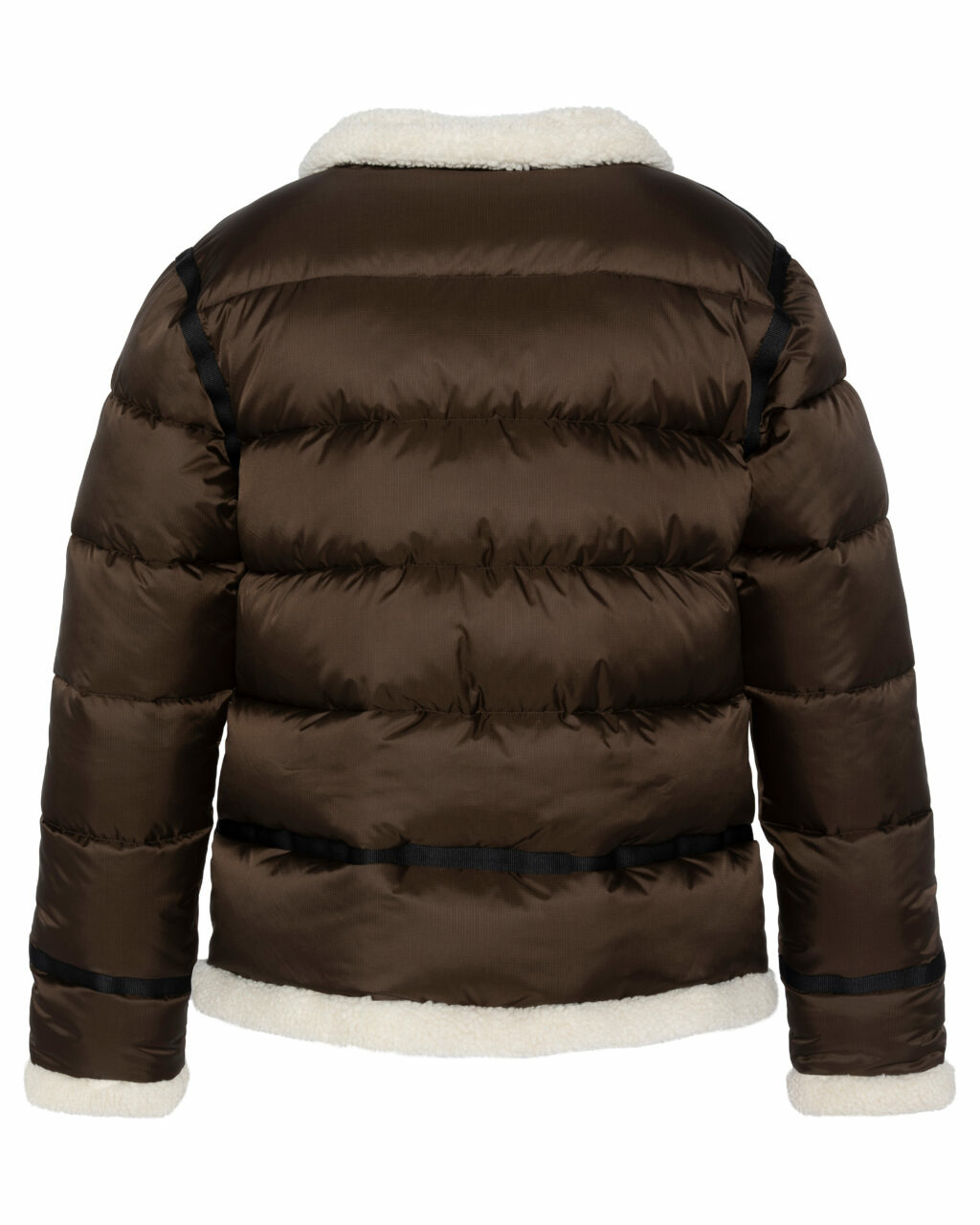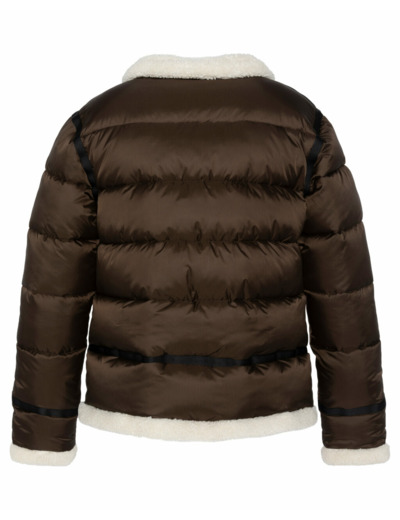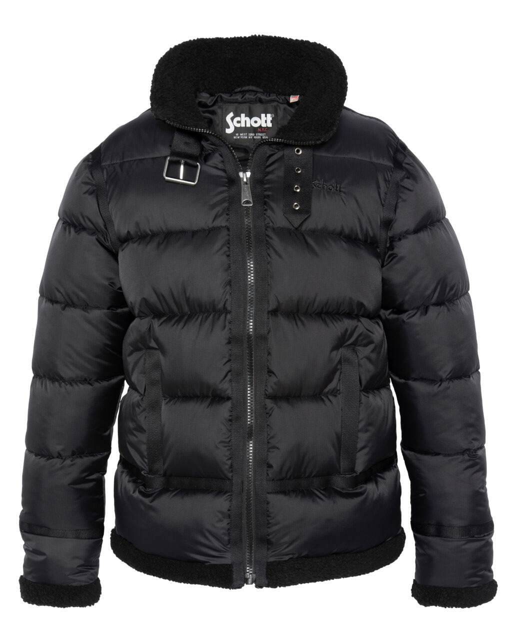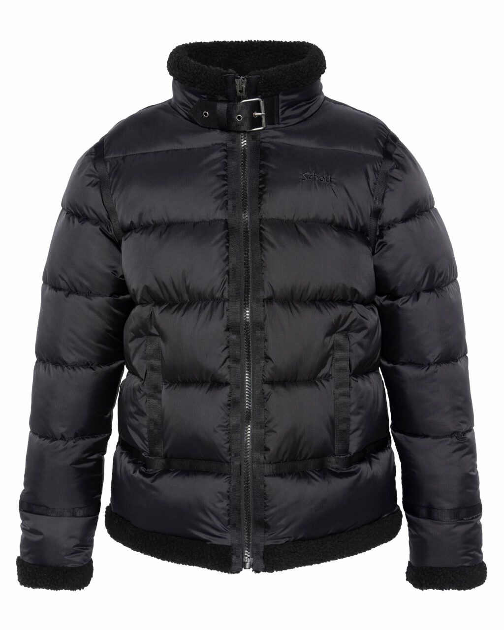 Extérieur 100% polyamide, doublure 100% polyester, rembourrage 100% polyester, col 100% polyester. Fermeture zippée frontale avec boucle de serrage au col. Deux poches basses zippées, une poche intérieure zippée, une poche intérieure pressionnée. Finitions sherpa au col, poignets et bas. Logo Schott NYC brodé poitrine. Matelassage uniforme.
