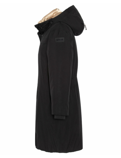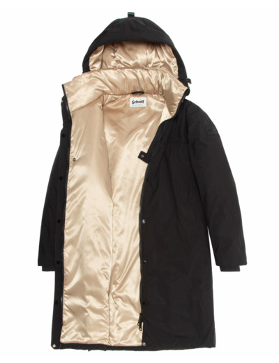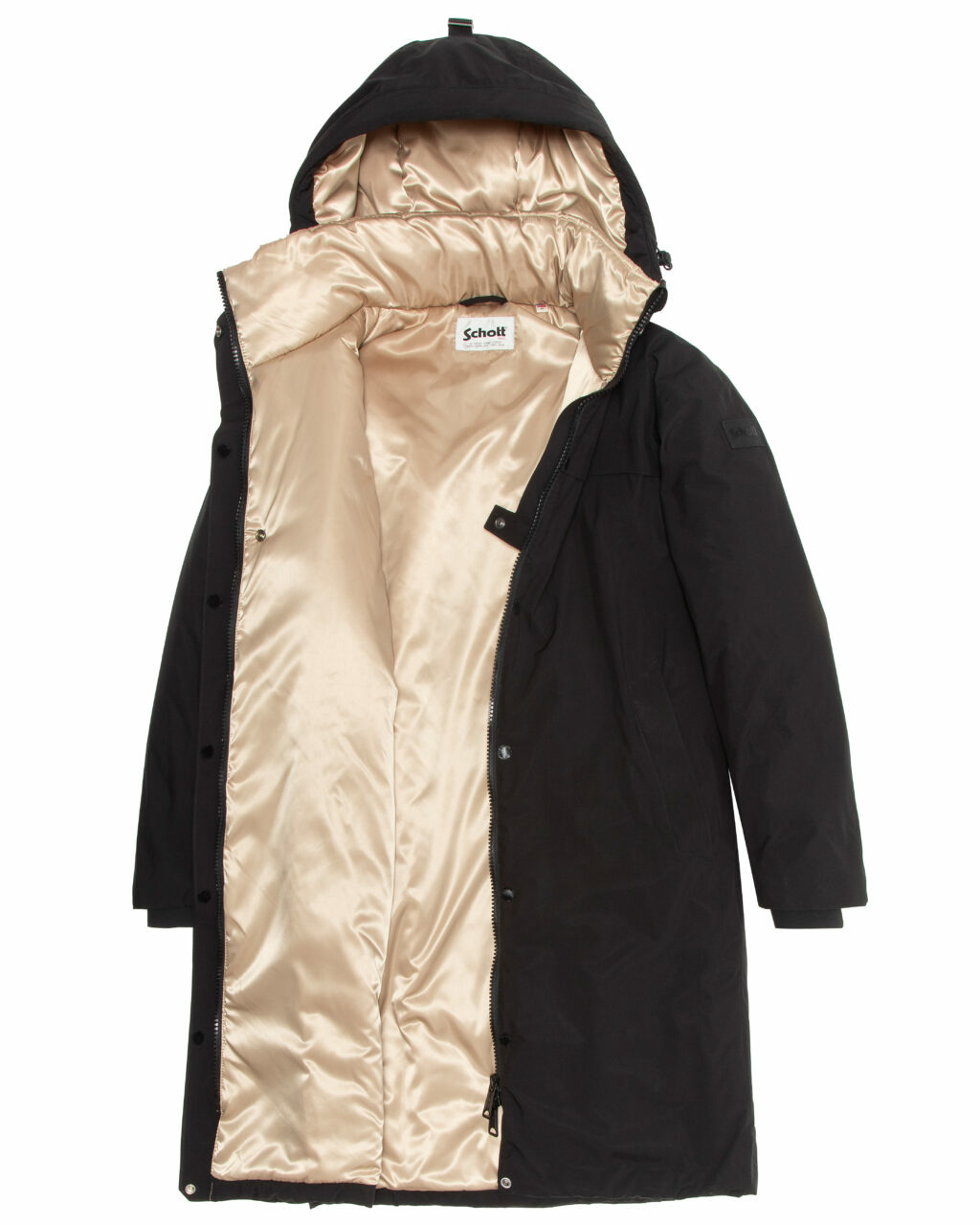 Fermeture zippée avec rabat pressionné, capuche ajustable, doublure satinée matelassée, poignets en bord-côte isolants, deux poches latérales fonctionnelles, badge Schott NYC sur la manche.