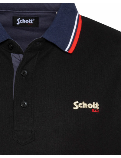 Logo brodé Schott NYC sur la poitrine, col contrasté avec bande tricolore, finitions de manches assorties, patte de boutonnage à trois boutons, coupe droite agréable à porter, tissu piqué respirant et texturé 100% coton.