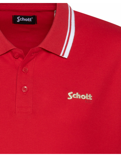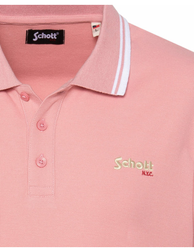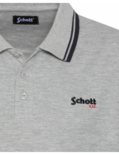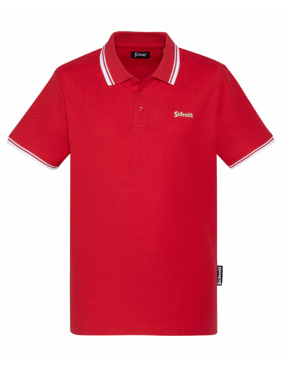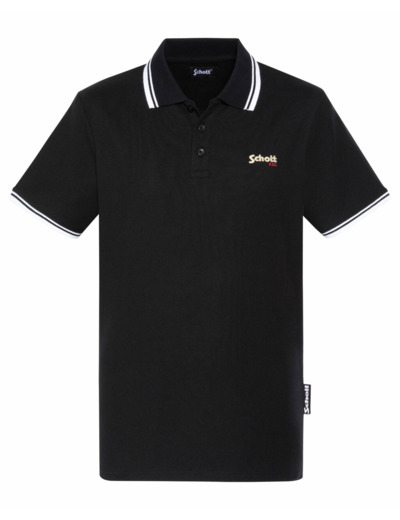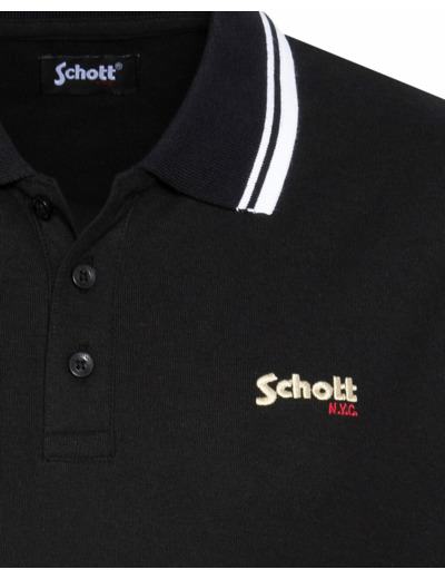 Le polo PSWILL2 présente un col structuré avec finition bord-côte rayée, une patte de boutonnage à trois boutons, des manches courtes avec bord-côte contrastant, et un logo brodé Schott NYC côté cœur. Sa maille piquée 100% coton est respirante et résistante, complétée par une coupe droite et une étiquette tissée latérale siglée.