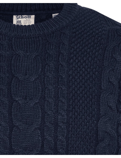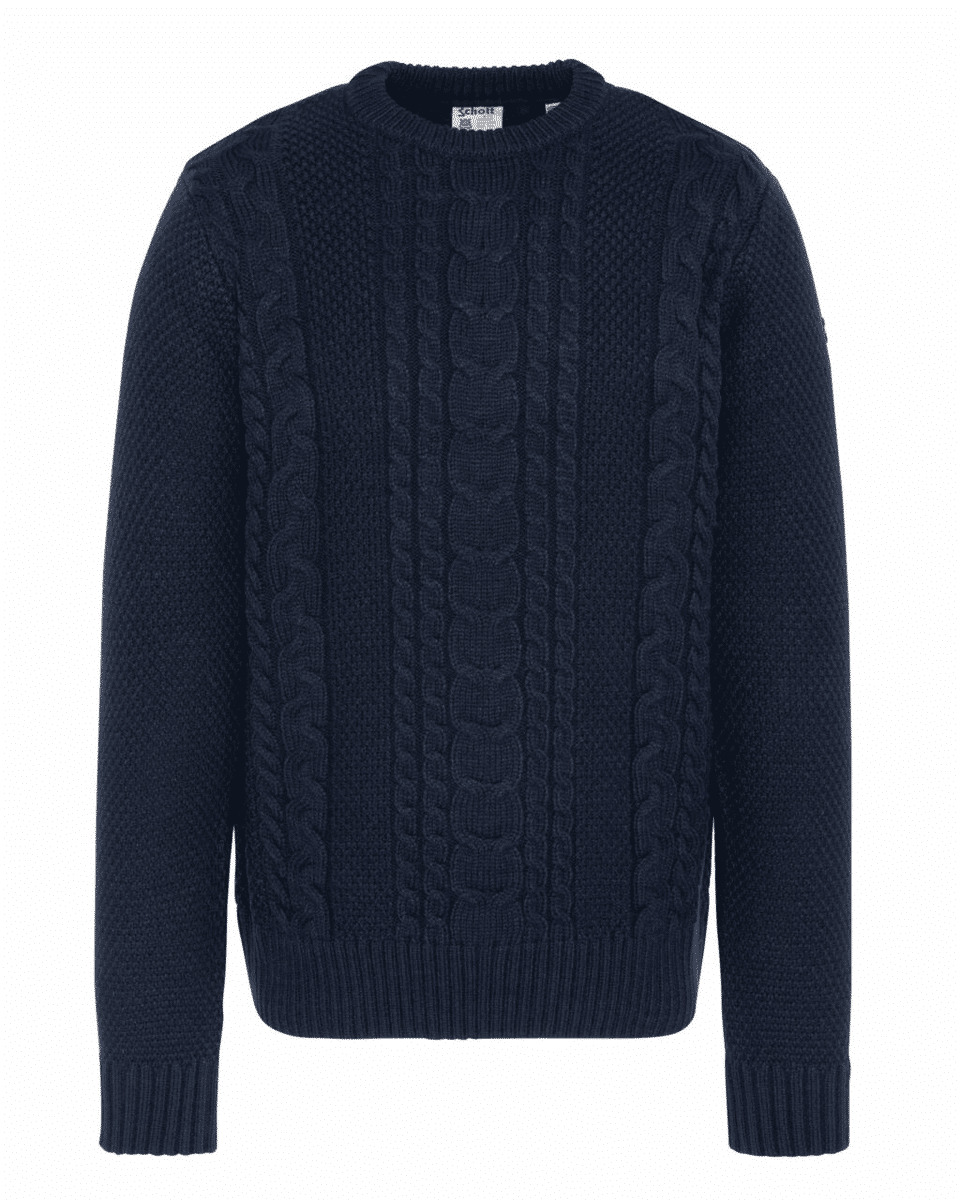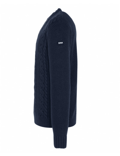 Matière : maille torsadée épaisse. Fermeture : aucun. Poches : aucune. Finition : poignets et ourlets côtelés. Logo cousu sur le bras gauche.