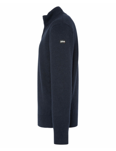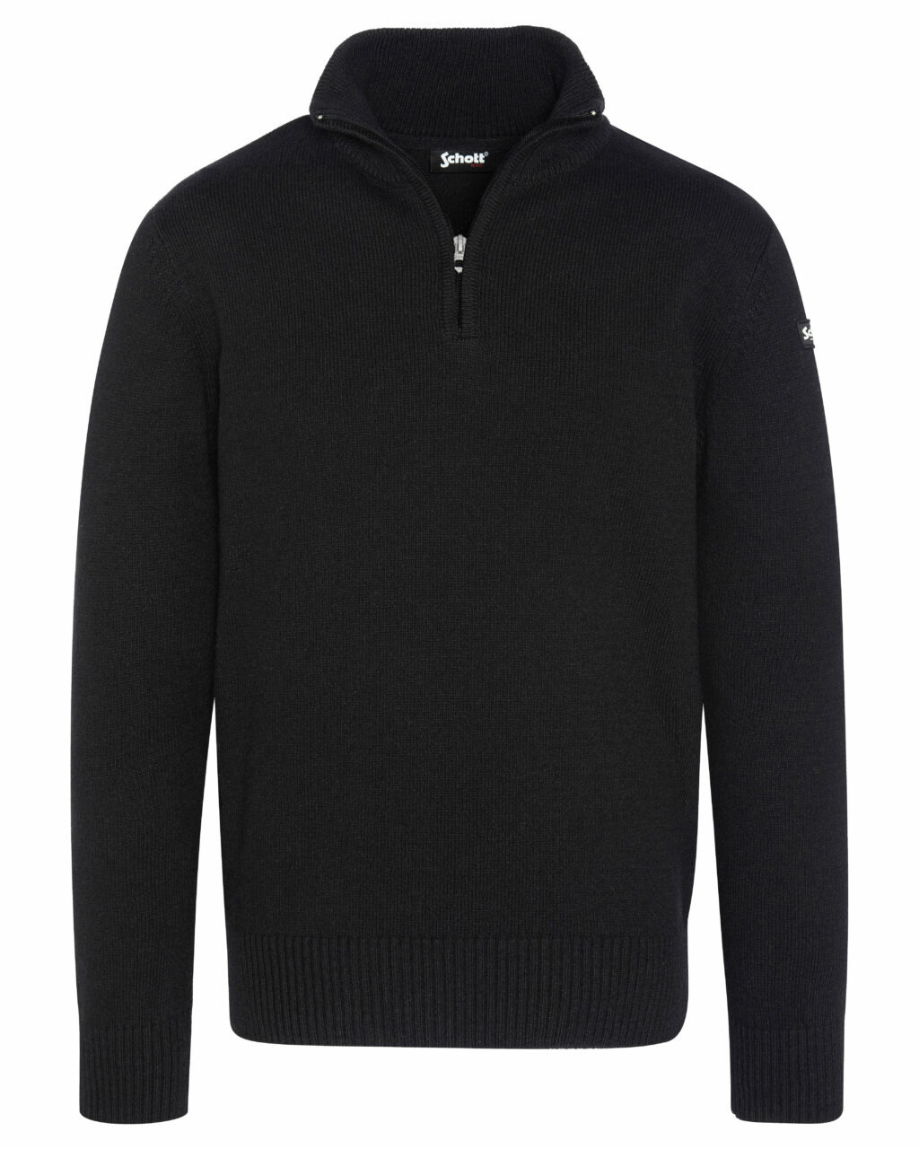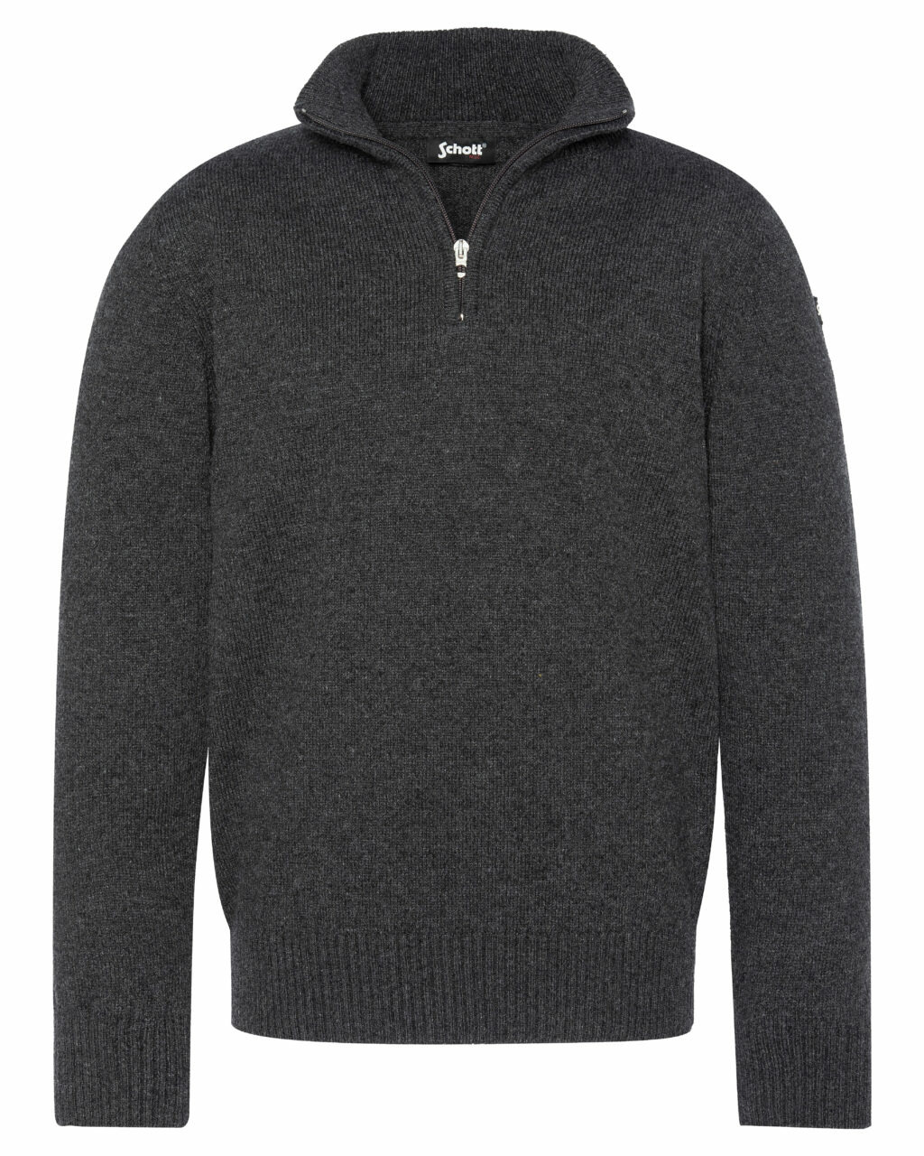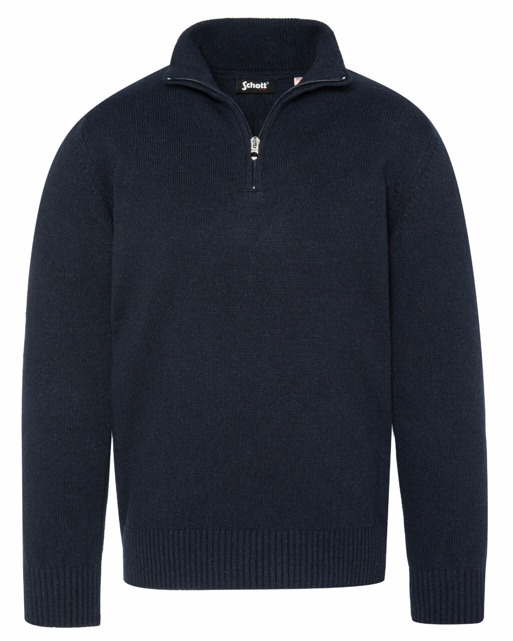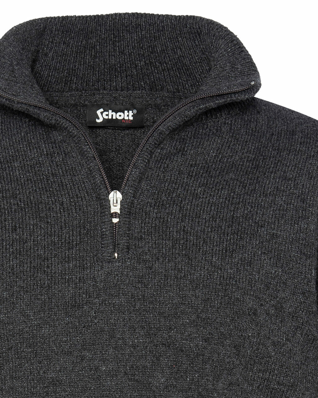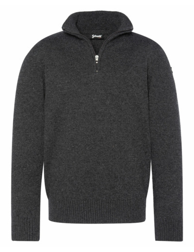 Fabriqué à partir d’un fil recyclé français et tricoté au Maroc, ce pull se compose de 36 % polyester recyclé, 28 % coton recyclé, 20 % acrylique recyclé, 10 % autres fibres recyclées et 6 % laine recyclée. Il dispose d’un col zippé, de finitions bord-côte au col, poignets et taille, ainsi que d’un badge logo Schott NYC® sur la manche gauche.