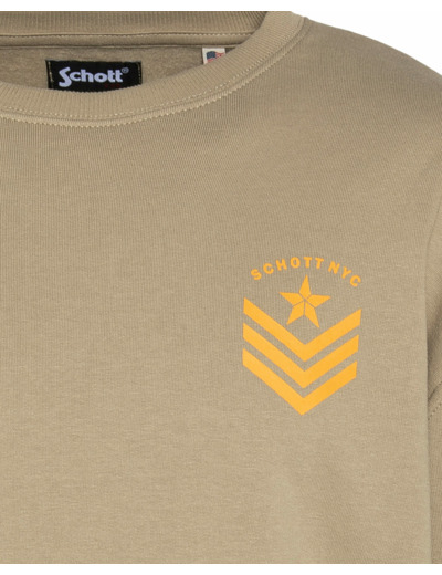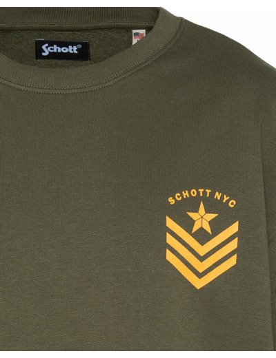 Ce sweat pour homme adopte une coupe droite confortable, idéale pour vos journées actives. Son imprimé army distinctif sur la poitrine gauche, orné de l’insigne étoilé Schott NYC, apporte une touche authentique et tendance. Confectionné en 80% coton et 20% polyester, il garantit douceur et robustesse, tandis que les finitions en bords-côtes aux poignets et à la taille assurent un maintien parfait. Son col rond classique facilite les superpositions avec vos vestes et blousons préférés, pour un look polyvalent et maîtrisé.
