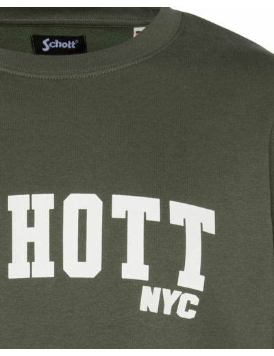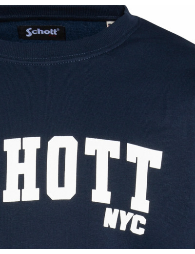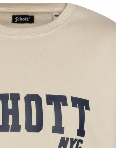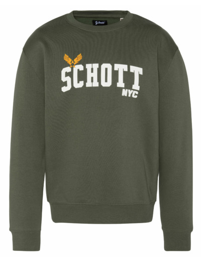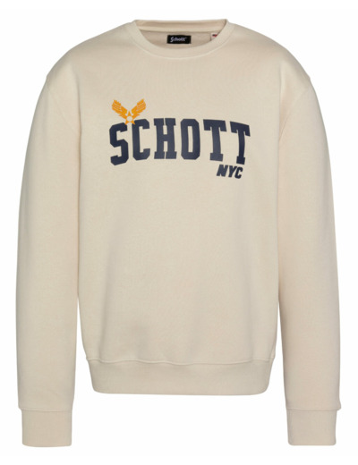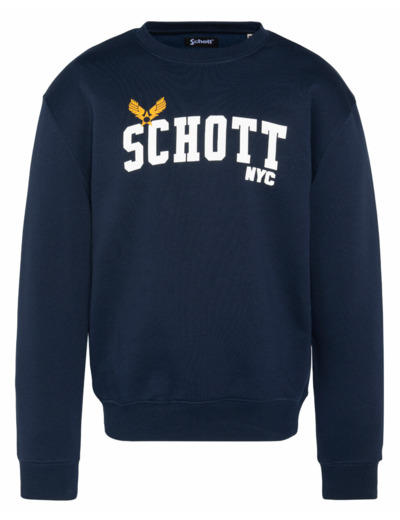Le modèle SWSTAR se distingue par un col rond classique avec surpiqûres apparentes, un logo Schott NYC imprimé XXL sur la poitrine, un motif aigle contrastant au-dessus du lettrage, des manches longues avec poignets côtelés, une taille élastiquée et une coupe droite confortable. Matière : 80% coton, 20% polyester. Finitions bord-côte au col, poignets et taille.