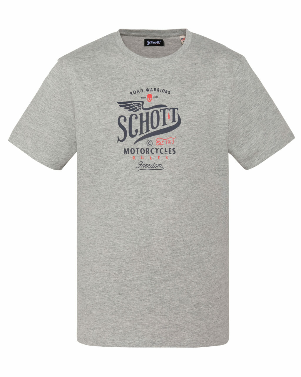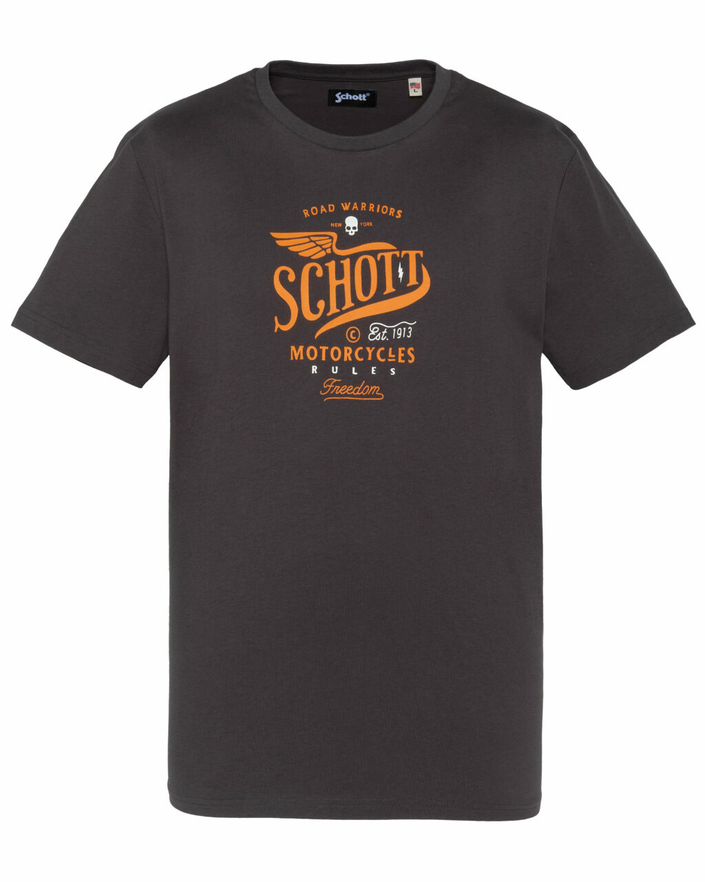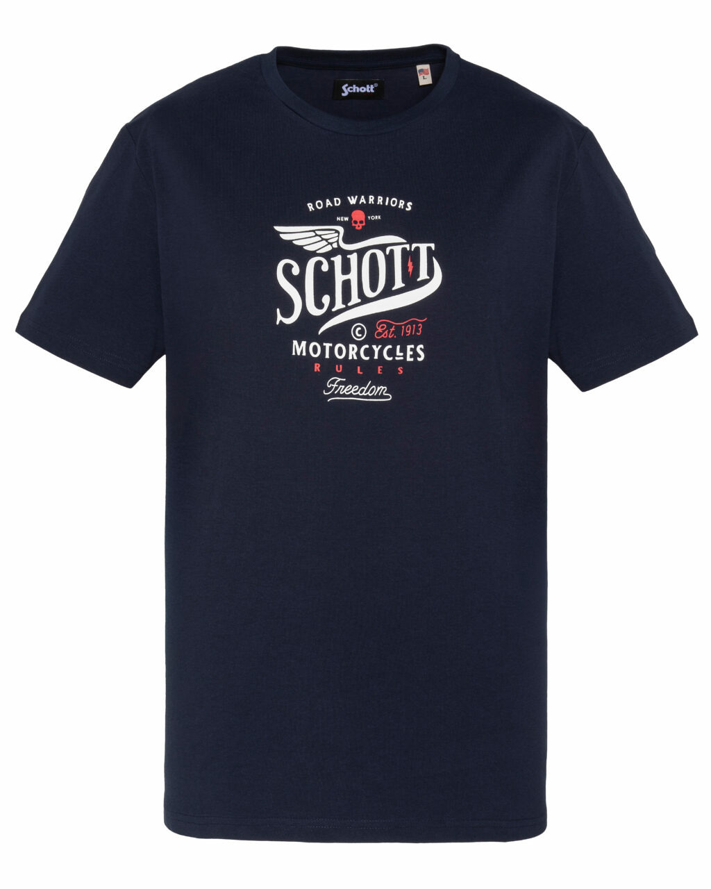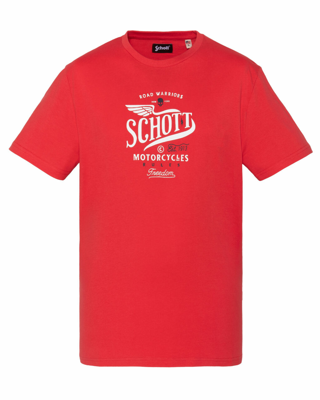 Confectionné en 100 % coton, ce t-shirt offre une douceur naturelle et une respirabilité optimale pour un confort durable. Sa coupe facile à porter et ses manches courtes s’adaptent parfaitement à toutes vos tenues, du jean brut au pantalon chino. Le col rond classique souligne une silhouette nette et moderne, tandis que l’imprimé poitrine Road Warriors Schott Motorcycles Rules Freedom apporte une touche rebelle et authentique.